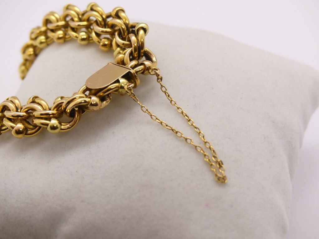 Hollow two-tone gold bracelet with double ringed links. Safety chain.