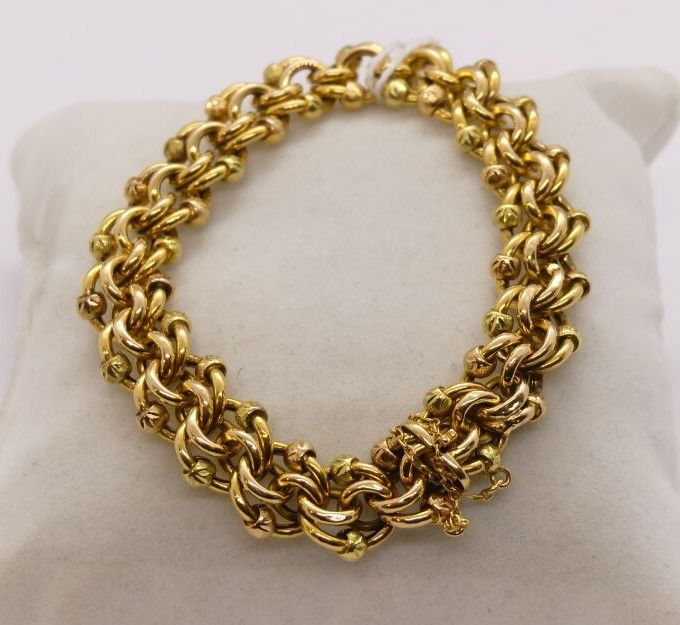 Hollow two-tone gold bracelet with double ringed links. Safe…