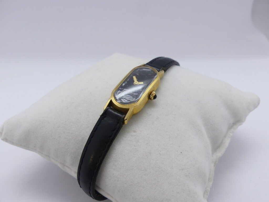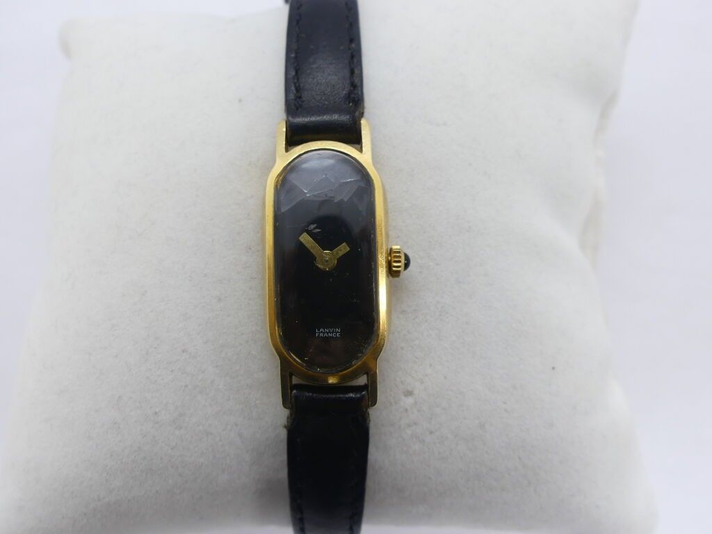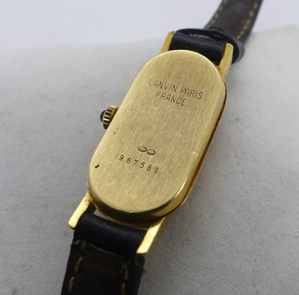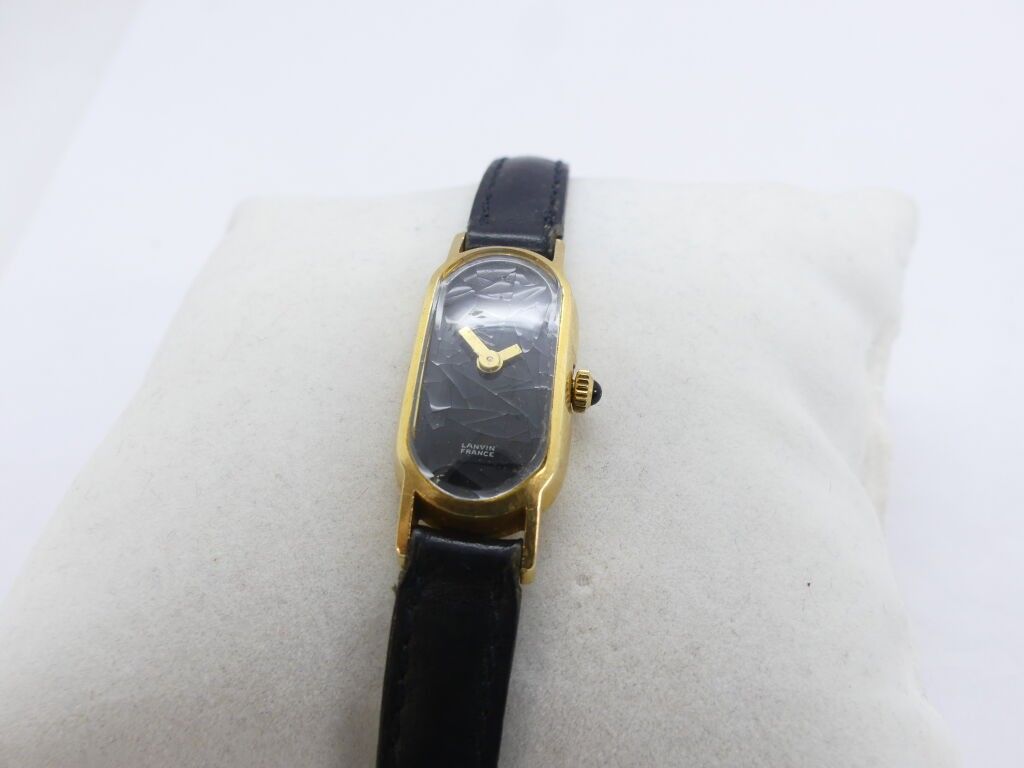 LANVIN Paris - Oval gold watch with black dial (cracked), original gold clasp, black leather strap, number 967589,