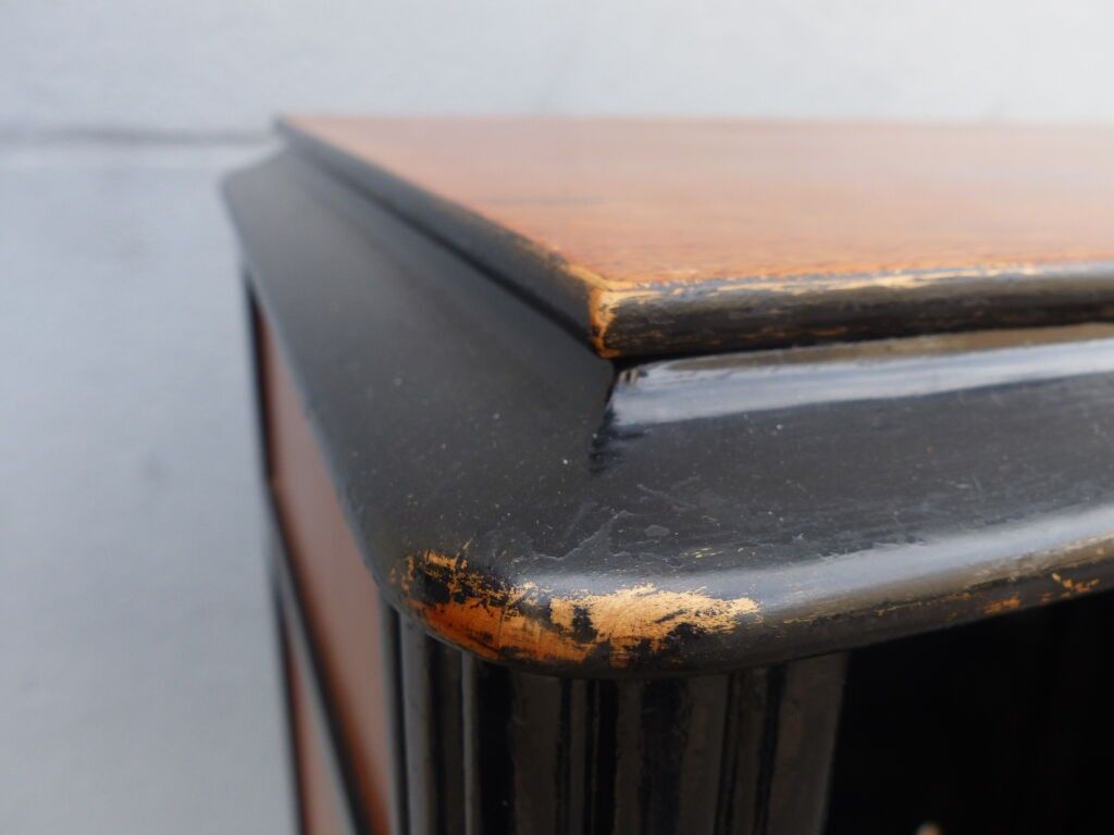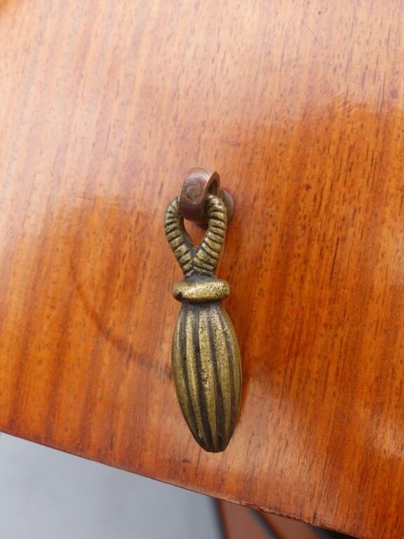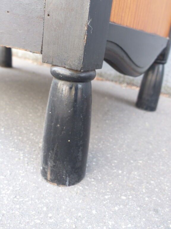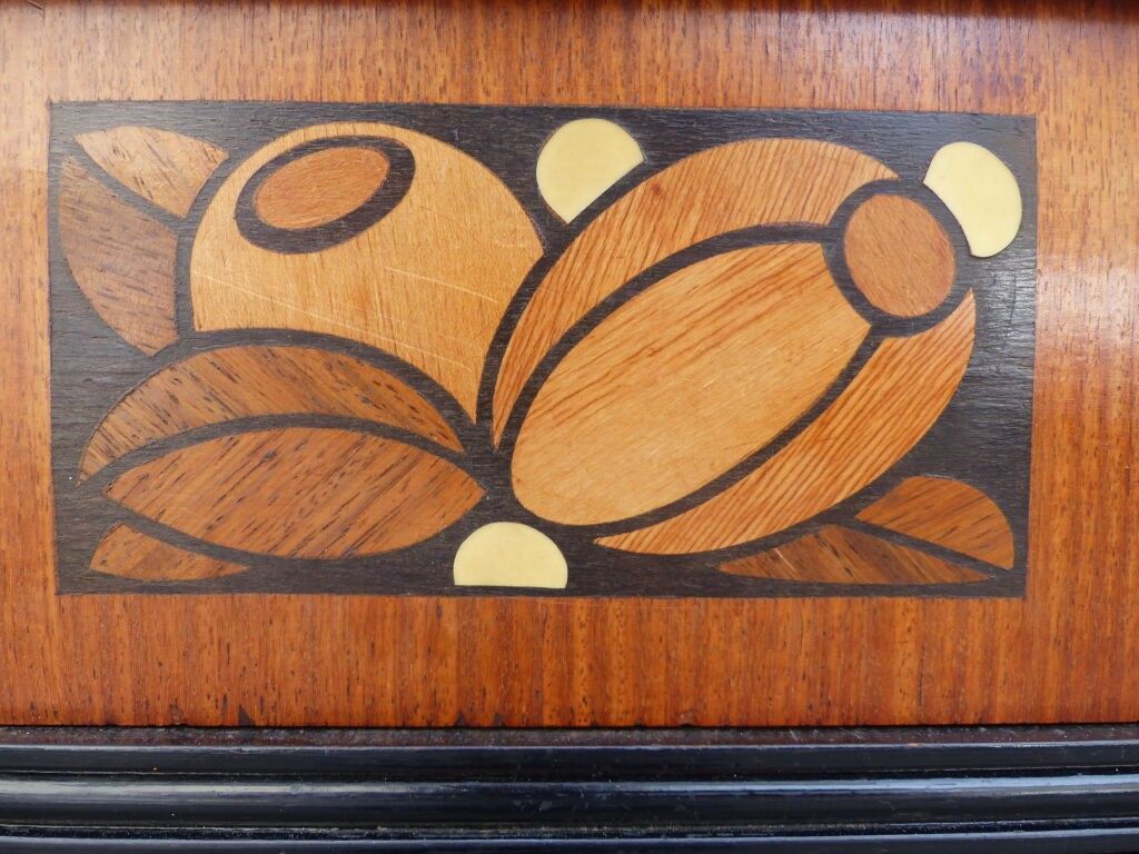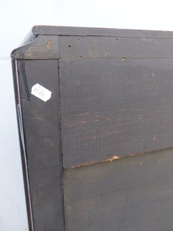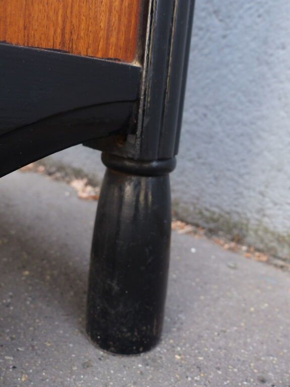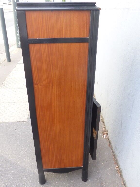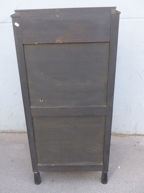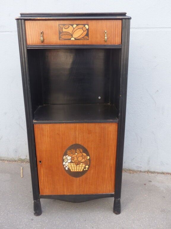 Blackened wood and courbaril cabinet opening with a cutter in the lower section (lock missing) and a drawer in the upper section with brass pine cone handles, floral inlaid decoration in galalith and mother-of-pearl, fluted jambs.