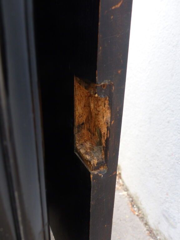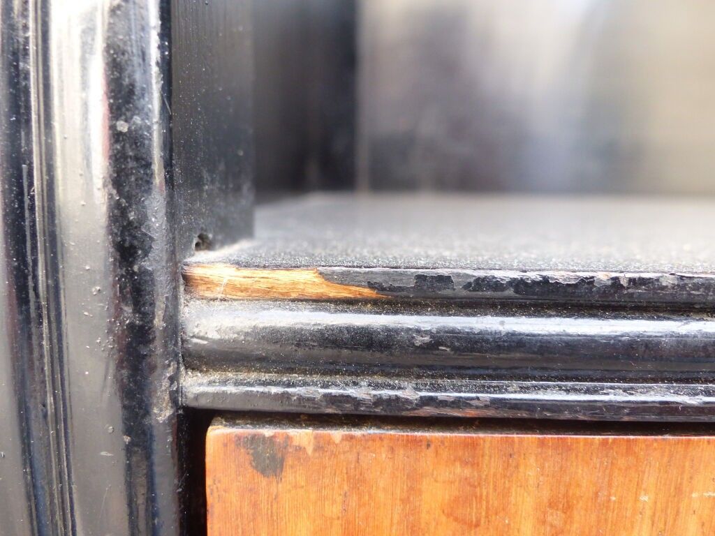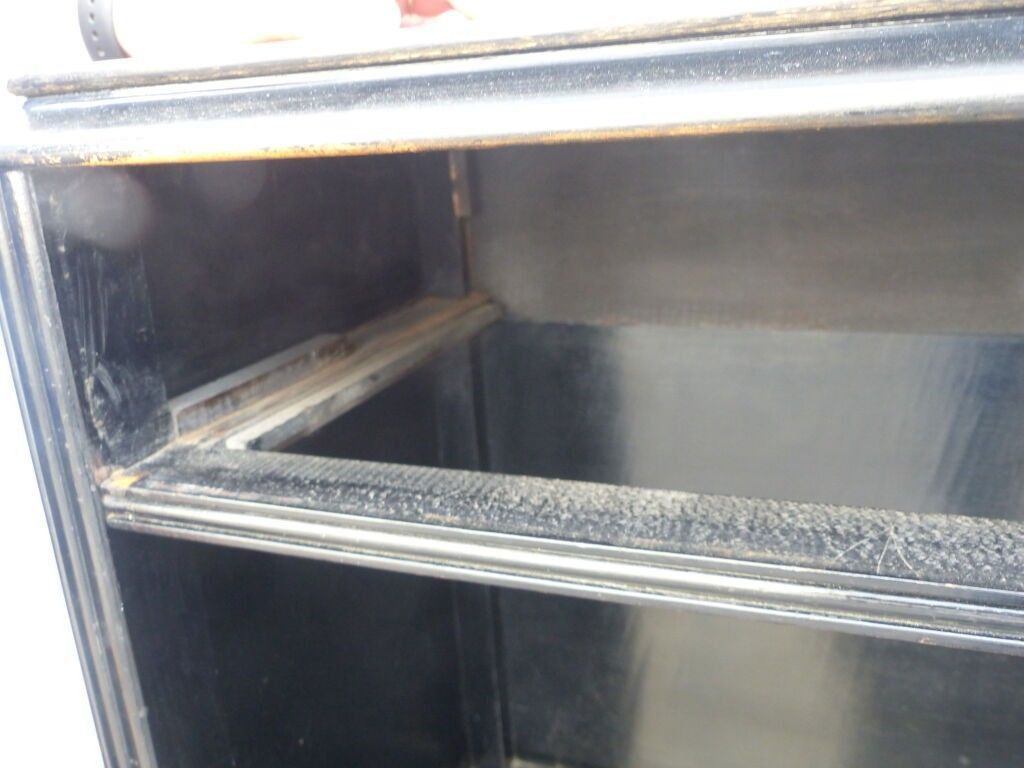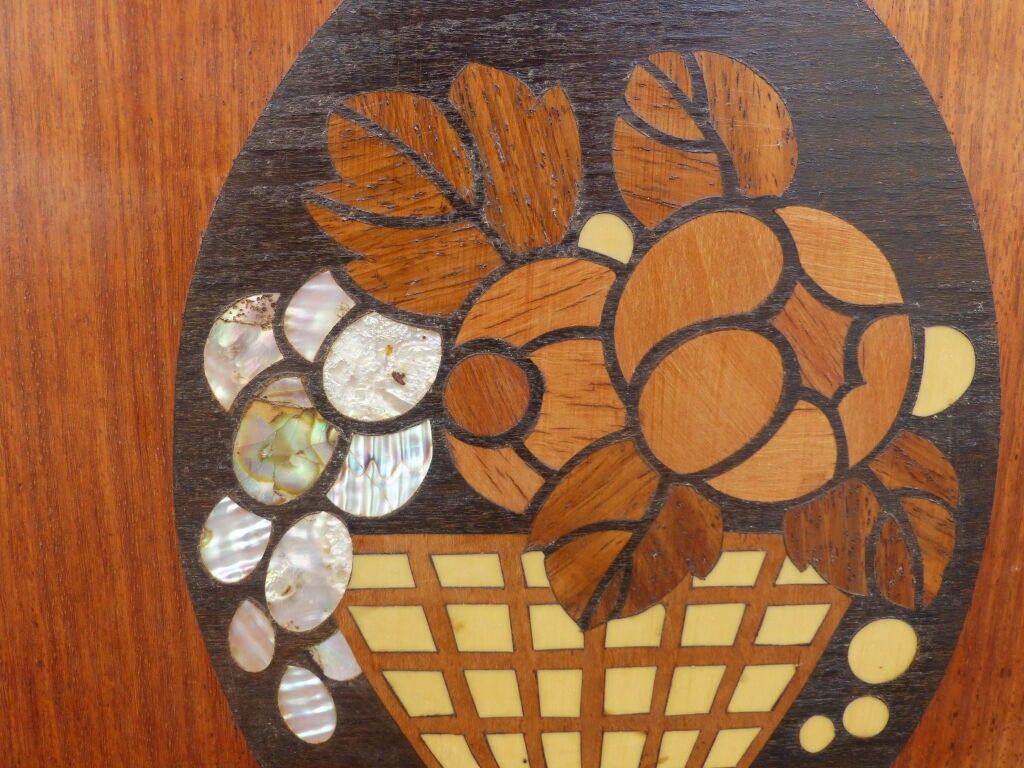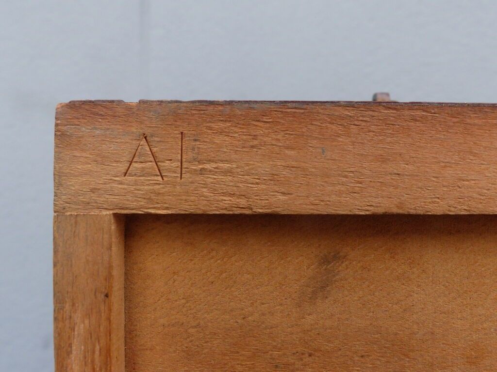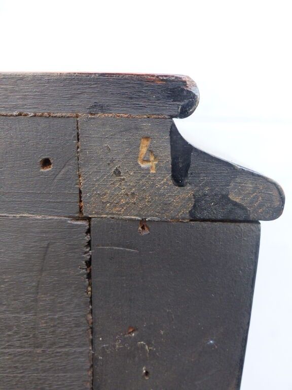 Blackened wood and courbaril cabinet opening with a cutter in the lower section (lock missing) and a drawer in the upper section with brass pine cone handles, floral inlaid decoration in galalith and mother-of-pearl, fluted jambs.