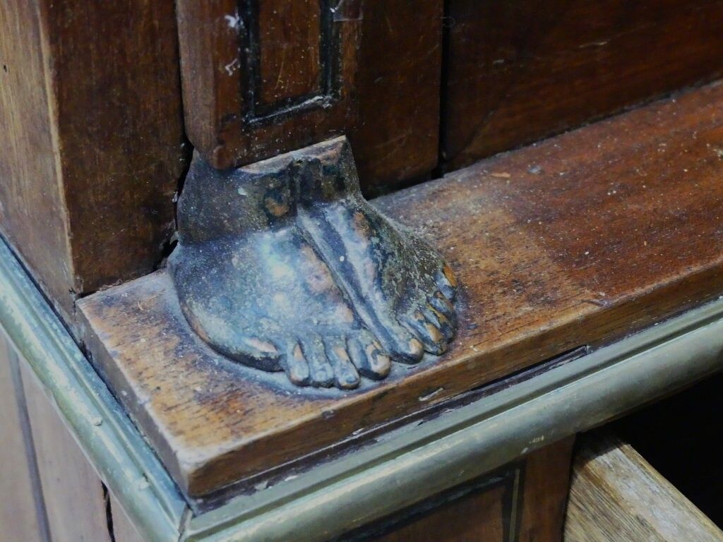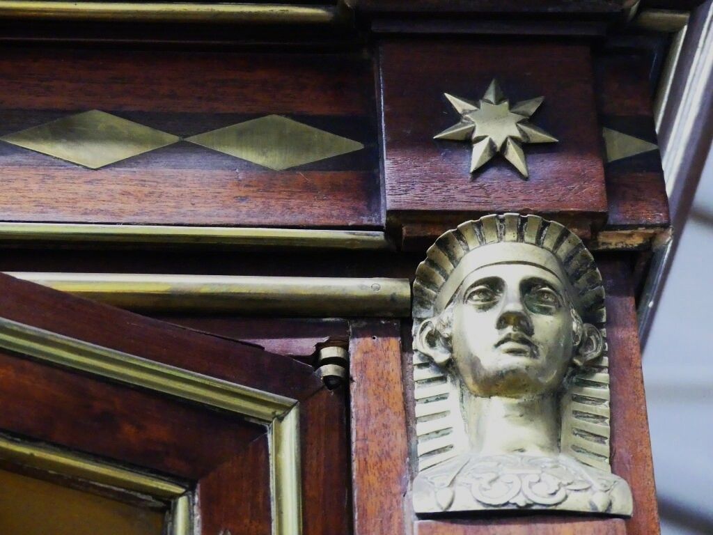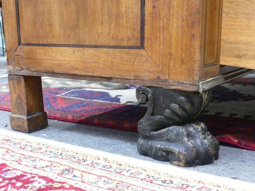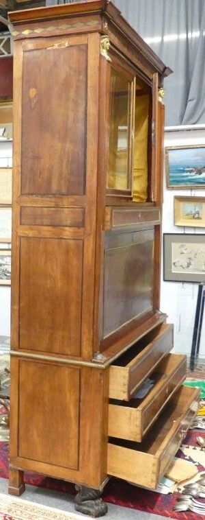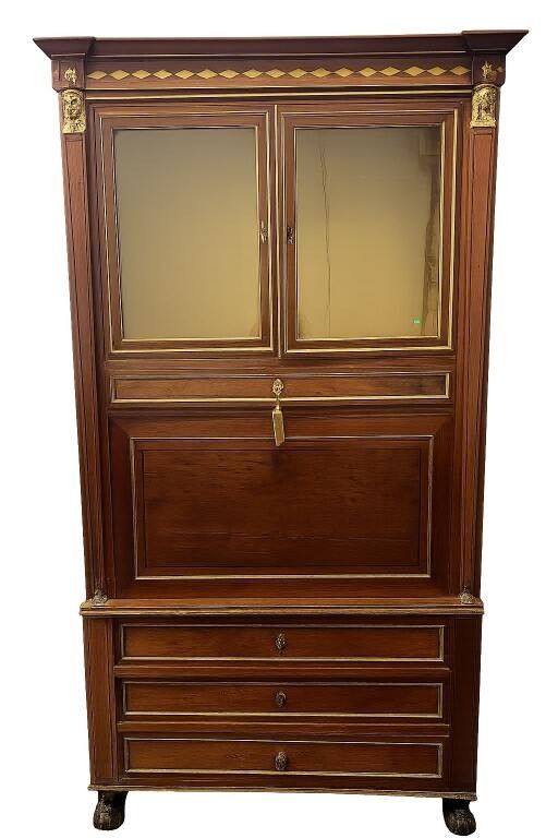 Mahogany veneered straight desk opening with a flap, 4 drawers and two glass doors at the top, claw feet.