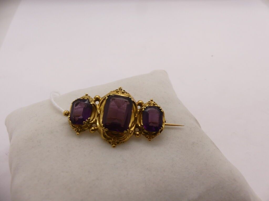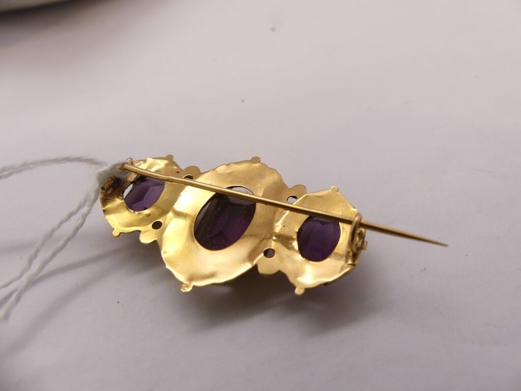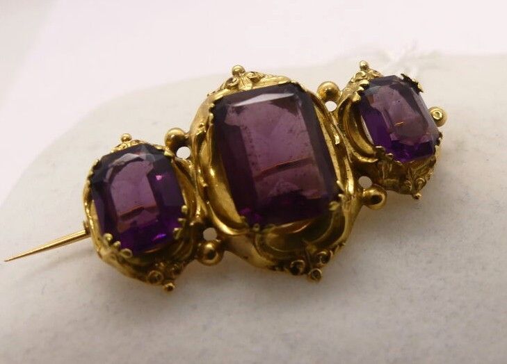 Brooch in repoussé yellow gold set with aligned amethysts,