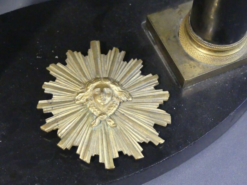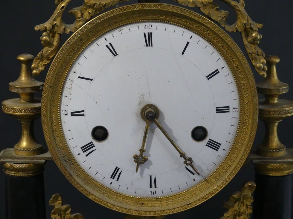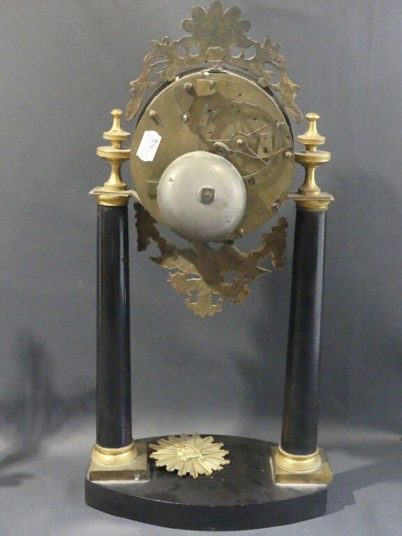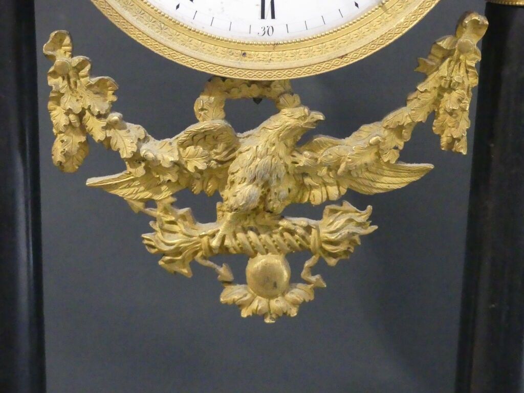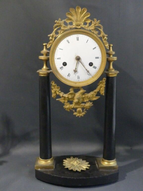 Portico clock in black marble and gilt bronze decorated with an eagle in a garland, palmette and foliage, enamelled dial with Roman numerals, sundial (damage to the stem)