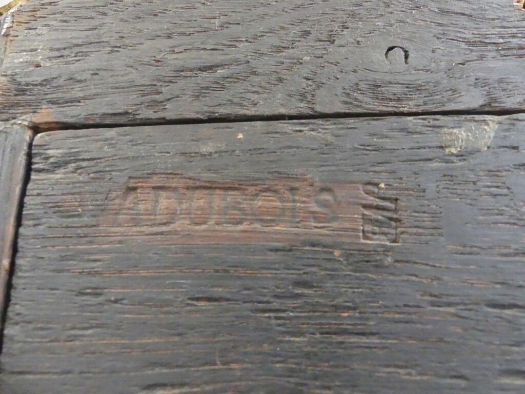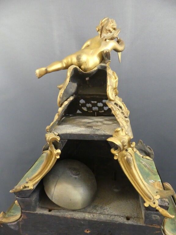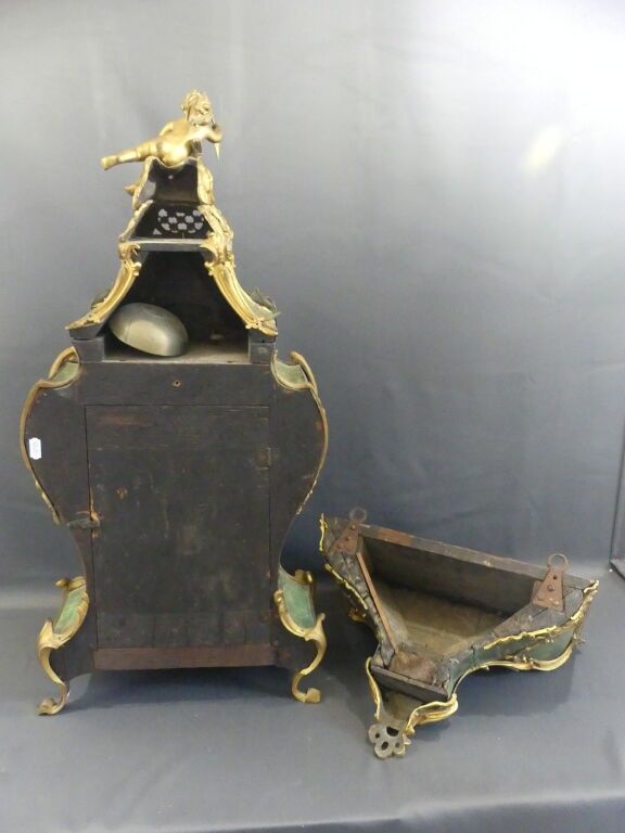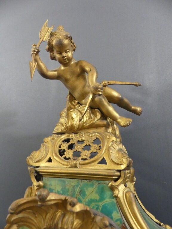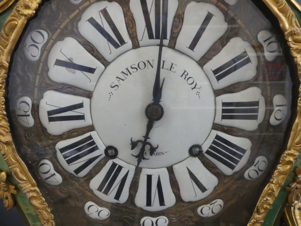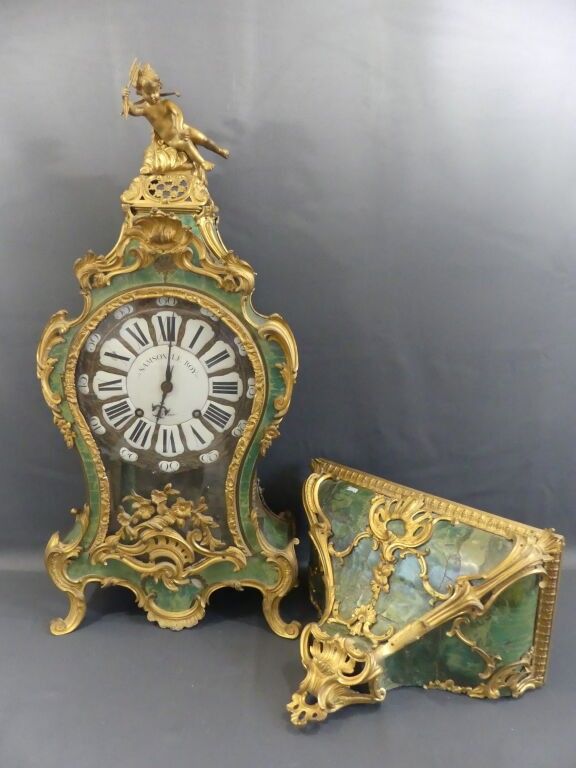 A violin-shaped cartel table and pedestal console in green-tinted horn veneer. Chased bronze ornaments decorated with a love drawing its bow, framed with foliage and garlands. The enamelled cartouche dial is signed SAMSON LEROY in Paris. The case is stamped by Adrien DUBOIS, master cabinetmaker in 1741.