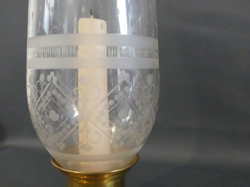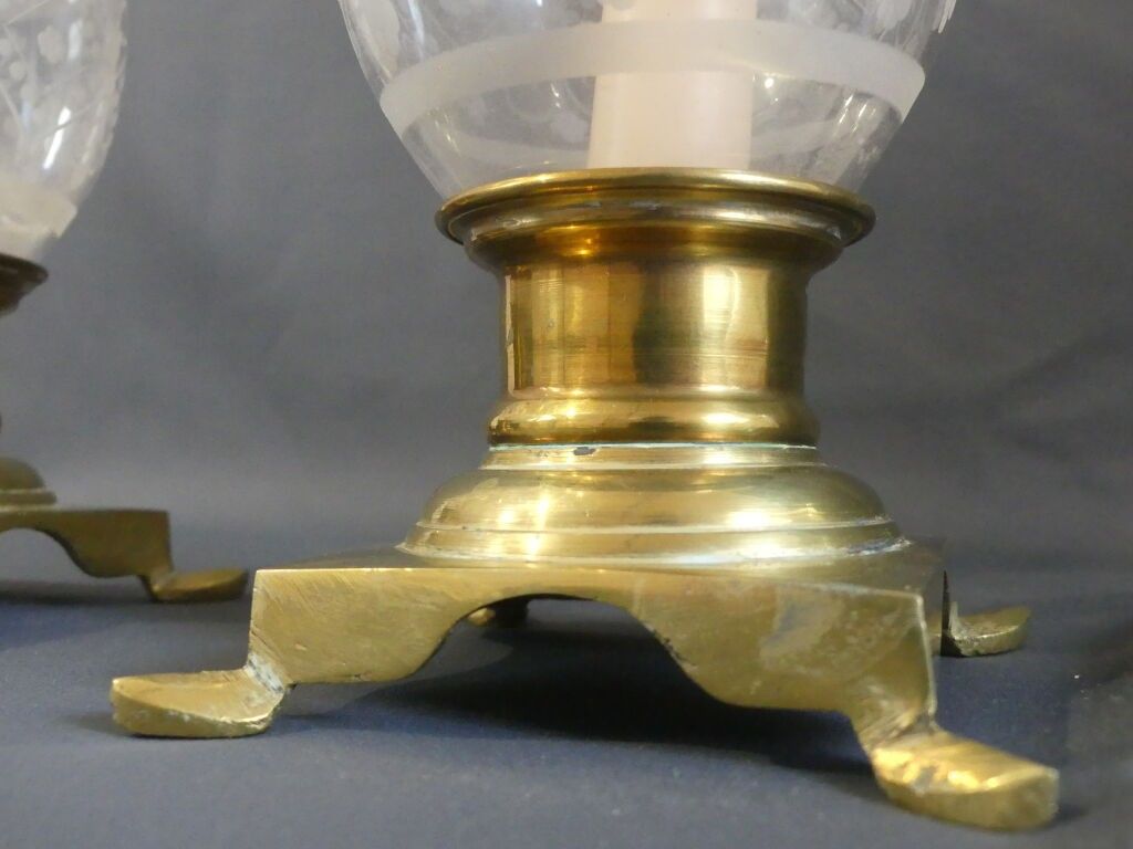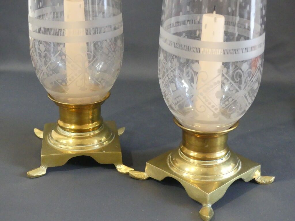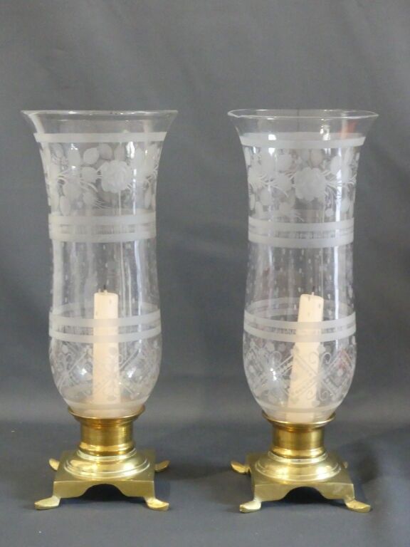 Pair of crystal lanterns engraved with foliate scrolls, square gilt brass base
