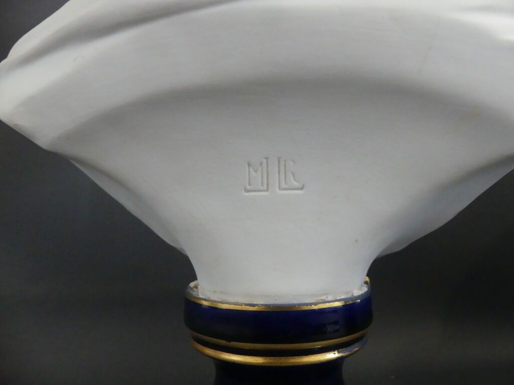 Bust of Marie-Antoinette in porcelain biscuit on a blue porcelain base with gilded fillets, monogrammed MR on the back and stamped under the base.