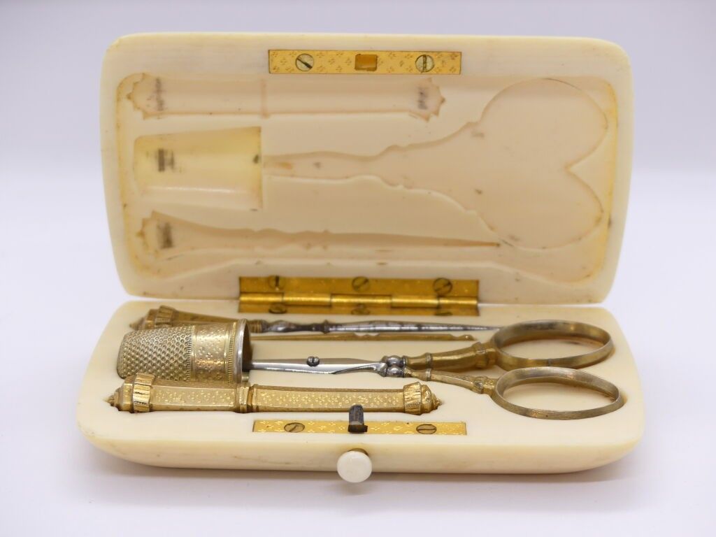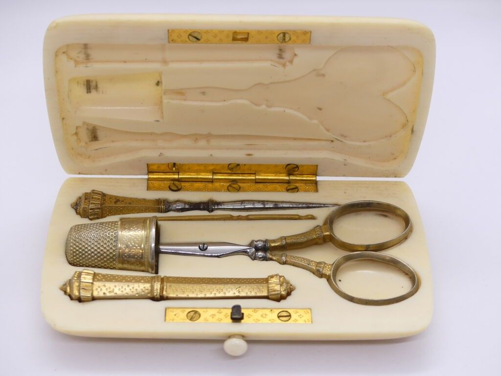 Silver sewing set with thimble, pair of scissors and needle …