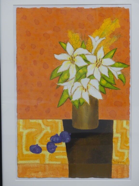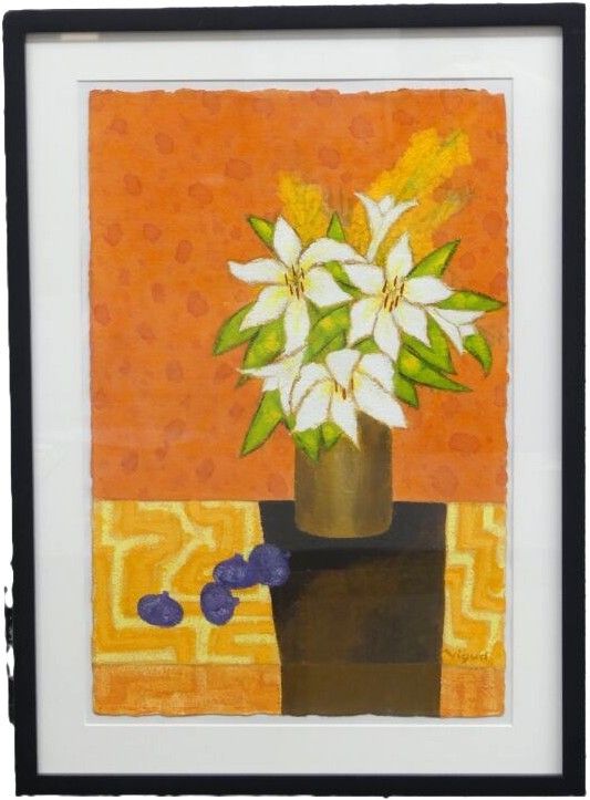 André VIGUD (born 1939) Bouquet of Lilies with Figs on an Or…