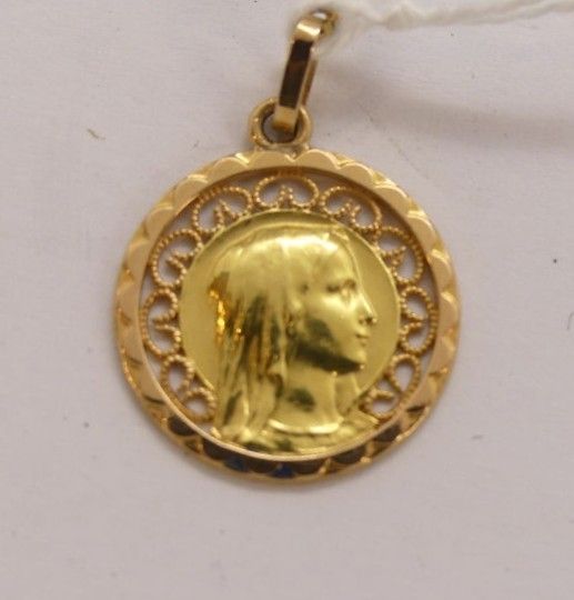 Gold christening medal with a profile of the Virgin Mary, en…
