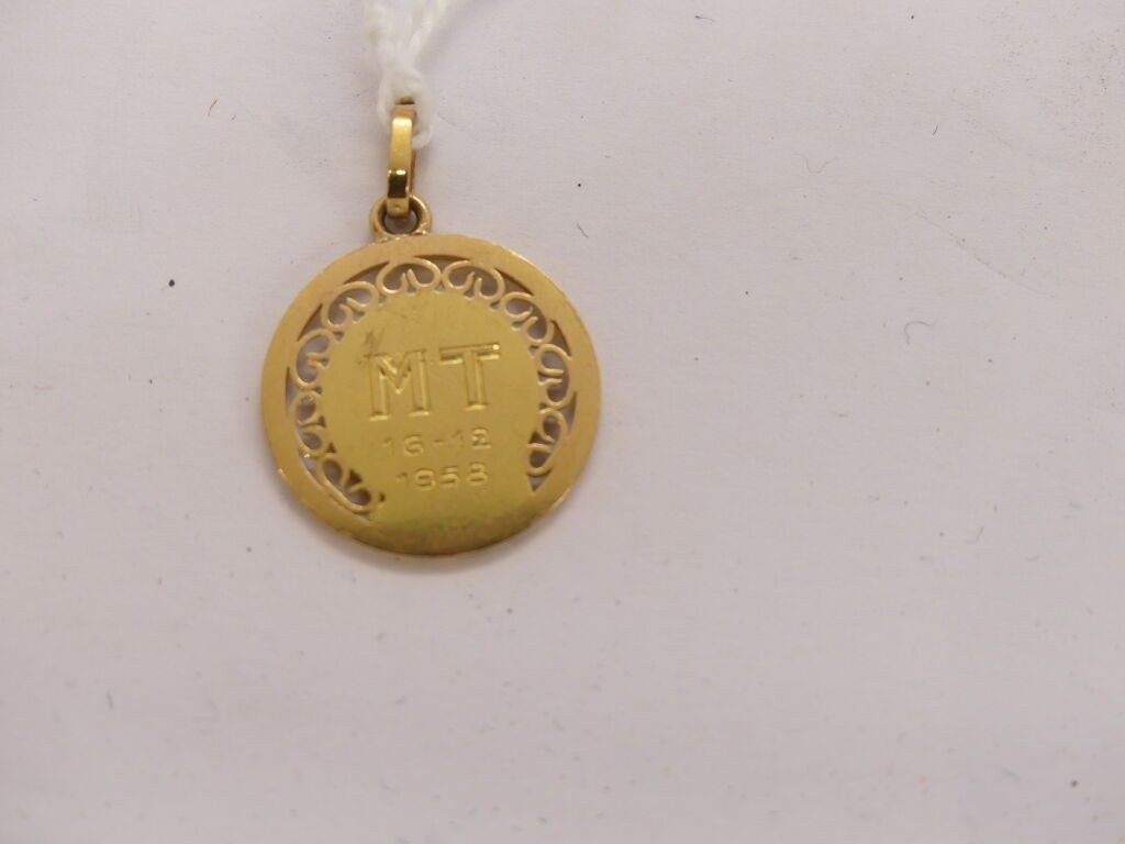 Gold christening medal with a profile of the Virgin Mary, engraved MT