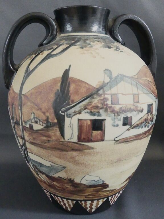 CIBOURE - GARCIA DE DIEGO - Ovoid vase with two handles decorated with a scene of a man and a woman returning from the fields accompanied by their oxen and a Basque house in a mountainous landscape - Signed GARCIA DE DIEGO in the decoration and marked R F CIBOURE on the bottom