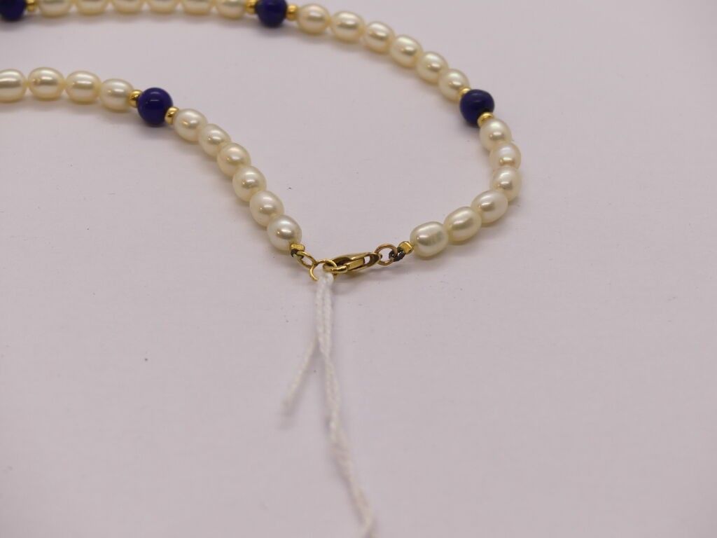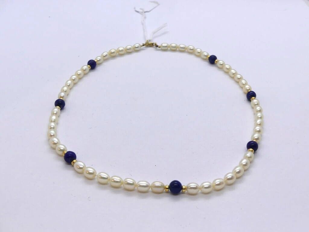 Necklace of oval freshwater pearls alternating with lapis lazuli pearls, yellow gold clasp