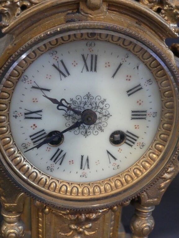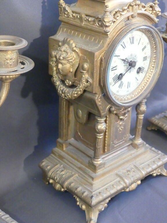 Gilt bronze mantel set including a clock decorated with espagnolettes and garlands of foliage, surmounted by a fleur-de-lys, enamelled dial with Roman numerals for the hours and Arabic numerals for the minutes (accidents), and a pair of candelabras surmounted by a fleur-de-lys.