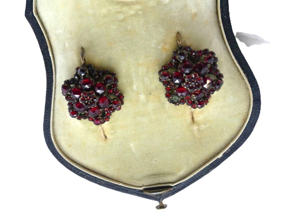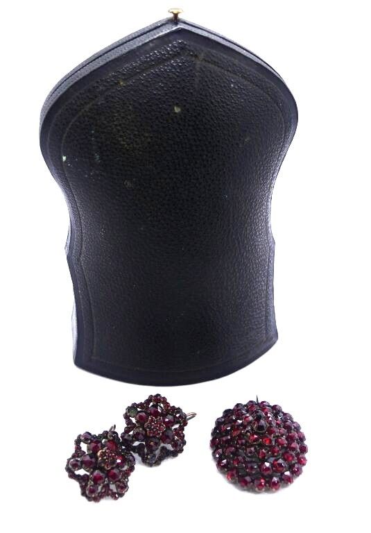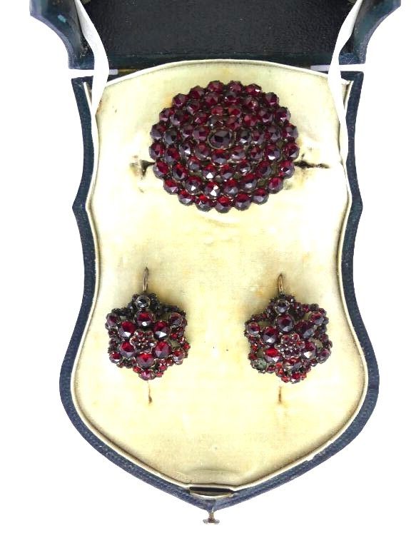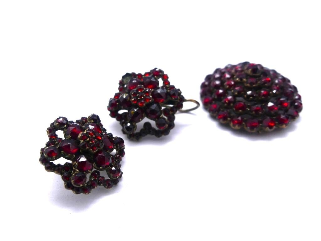 Flower-shaped set with garnet rhinestones, including brooch and pair of earrings. Jewellery box.