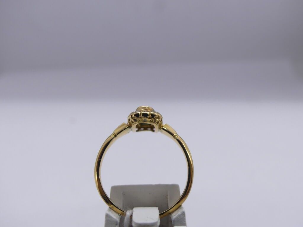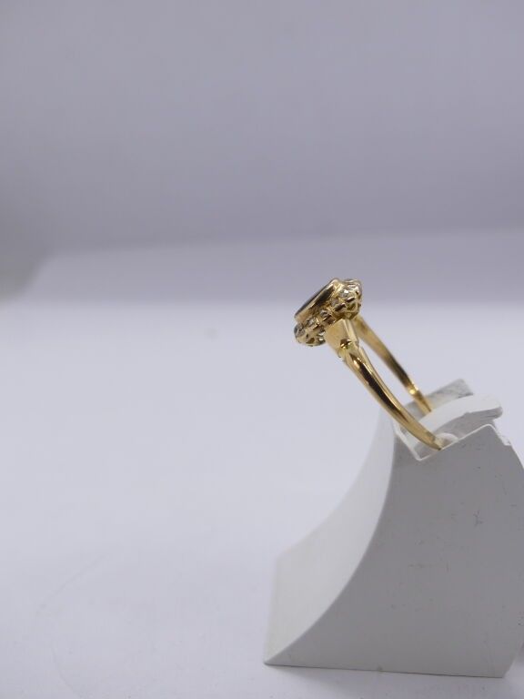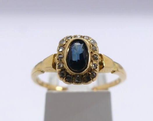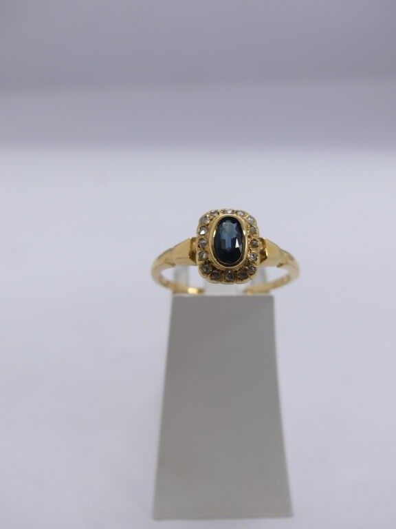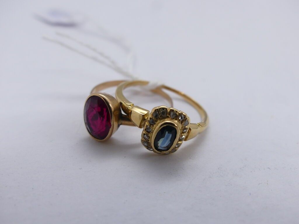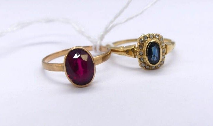 2 yellow gold rings centred on a red rhinestone and a blue stone surrounded by brilliants,