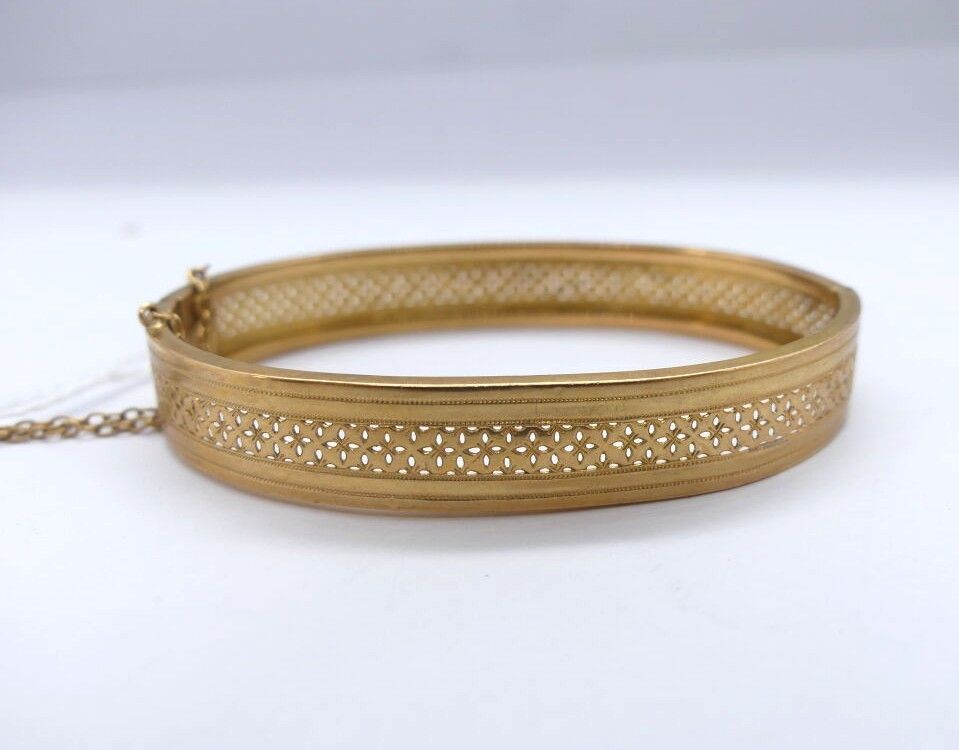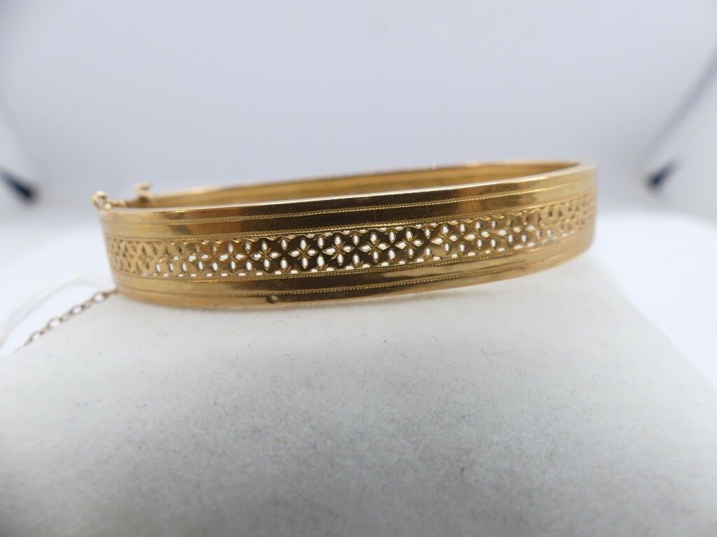 Ribbon bracelet with openwork rosettes in yellow gold, safety chain.