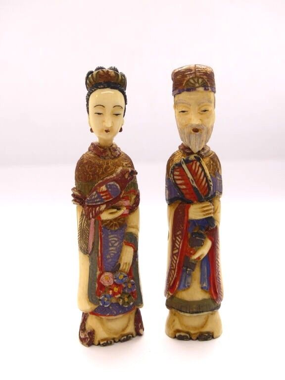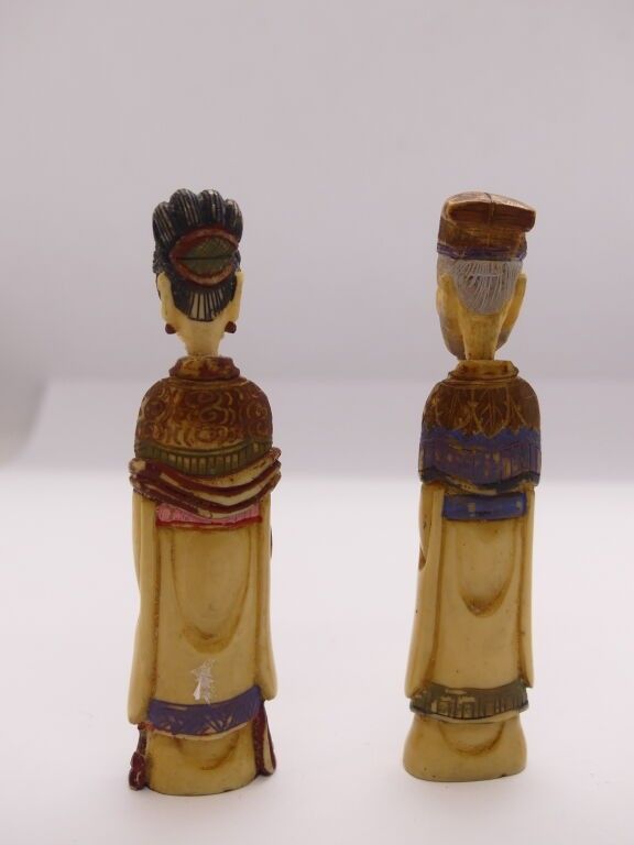 CHINA - Pair of polychrome bone snuffboxes: Couple of dignitaries. H. 8 cm