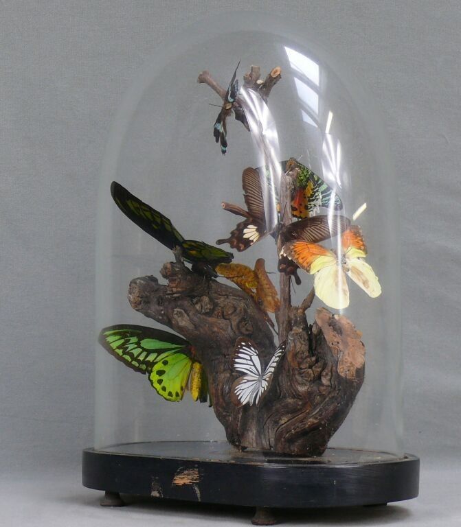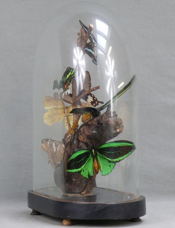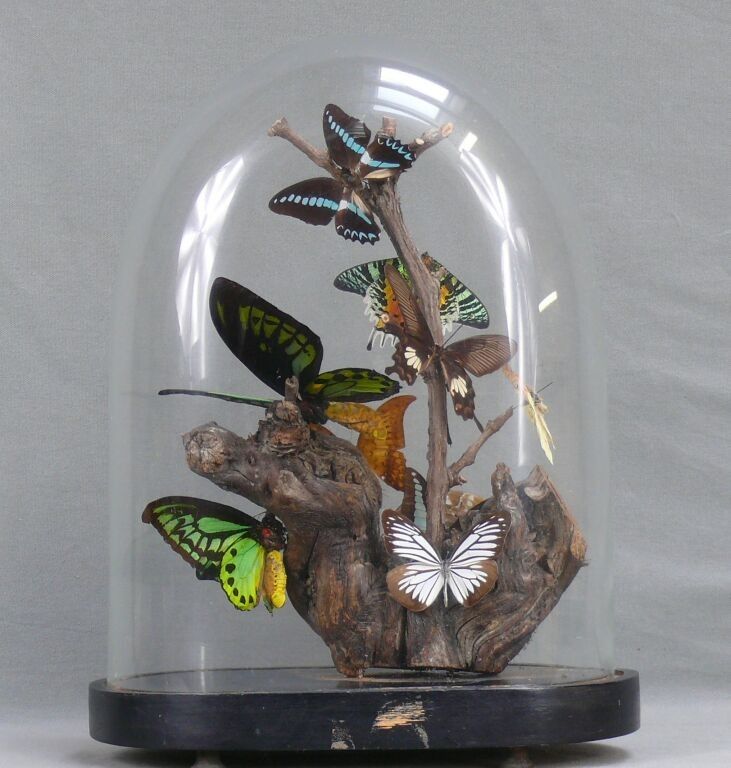 Composition under globe: O. priamus ssp. including priamus (CITESII/UEB with Cites no.), Dabasa payeni, Graphium including milon, Hebomoia leucippe and Valeria. Some butterflies in fair condition.