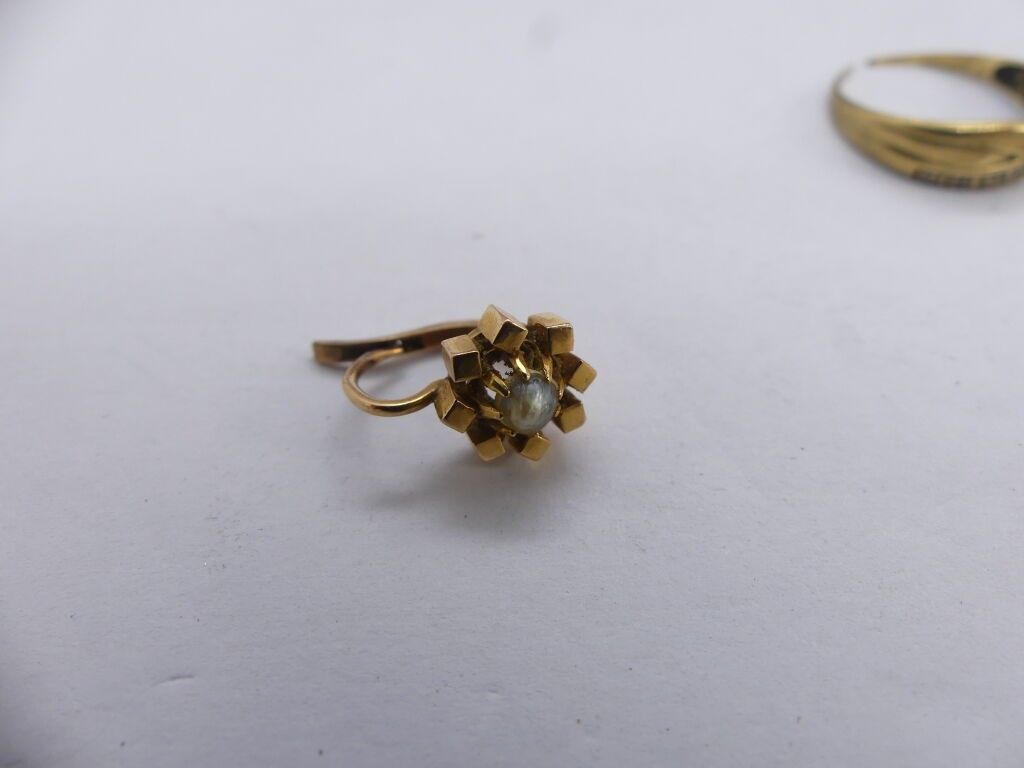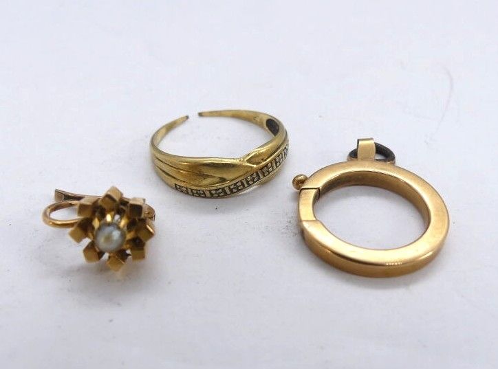 Yellow gold lot: ring (broken), watch chain clasp, flower earring.