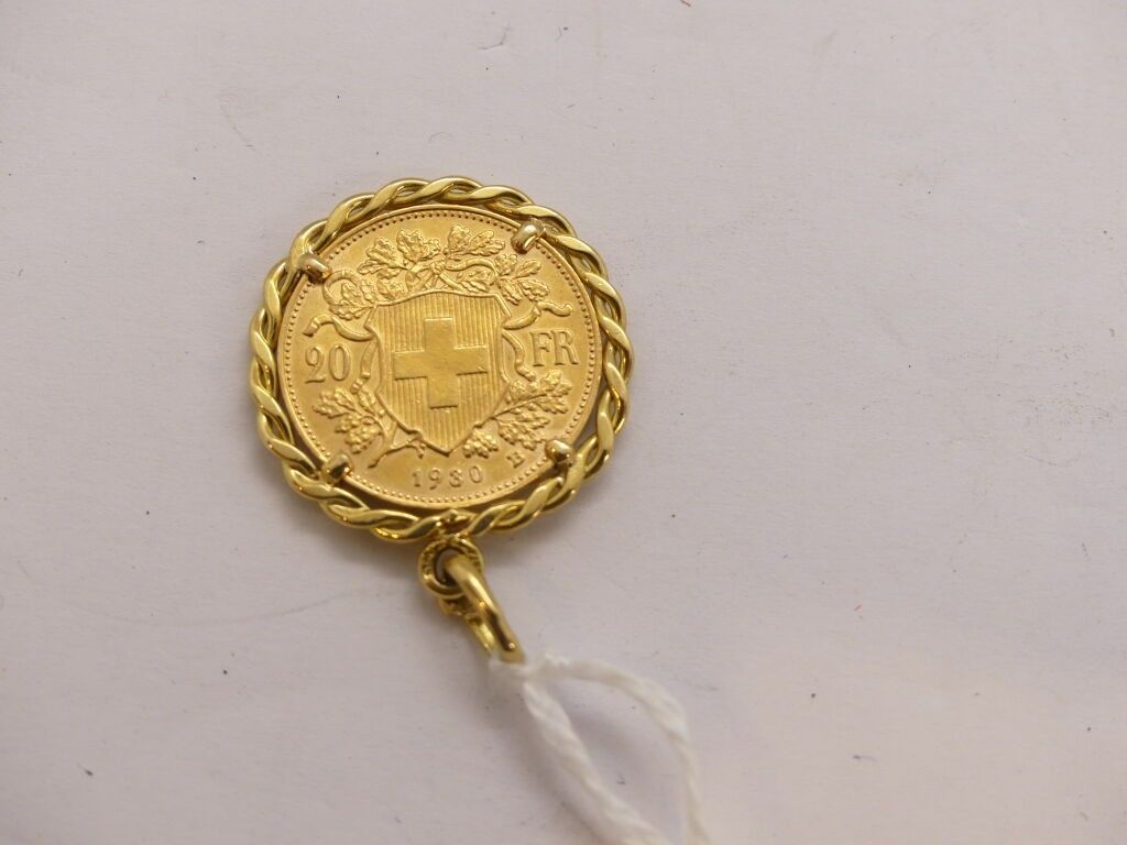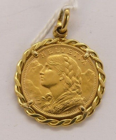 20 Swiss franc Helvetia gold coin mounted as a pendant on gold.