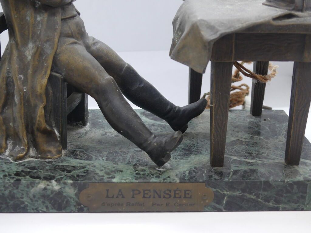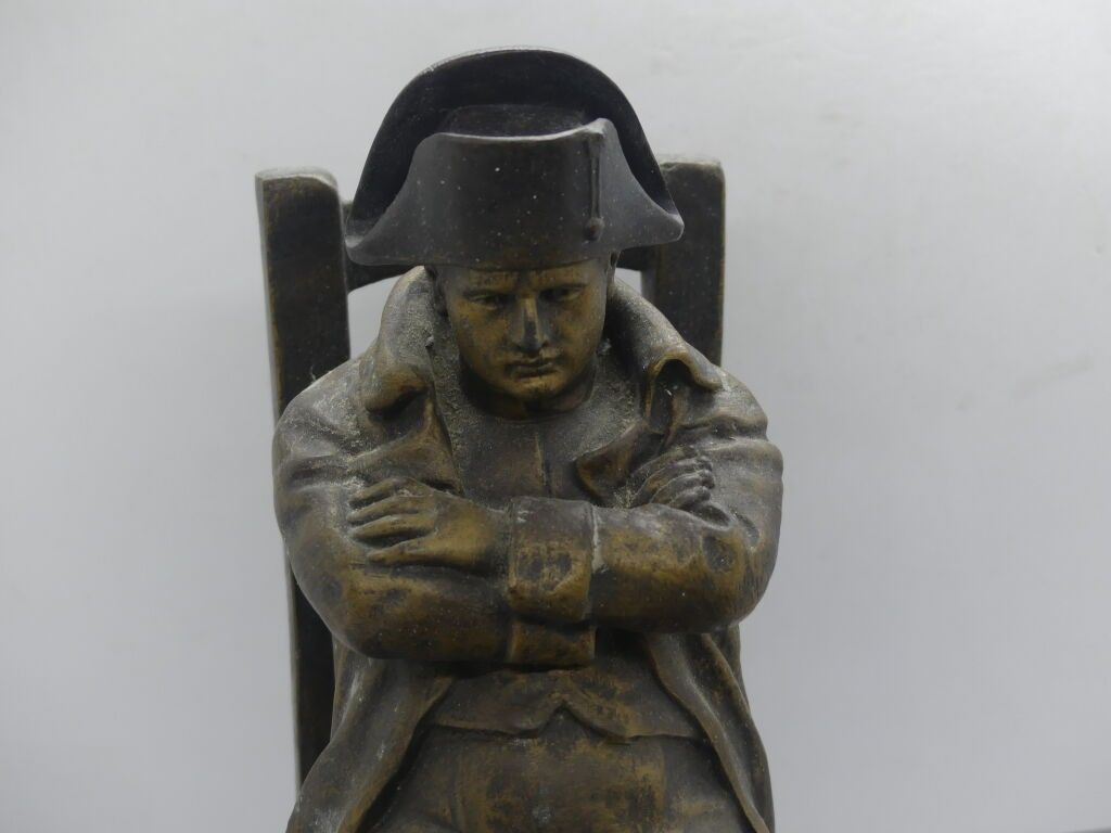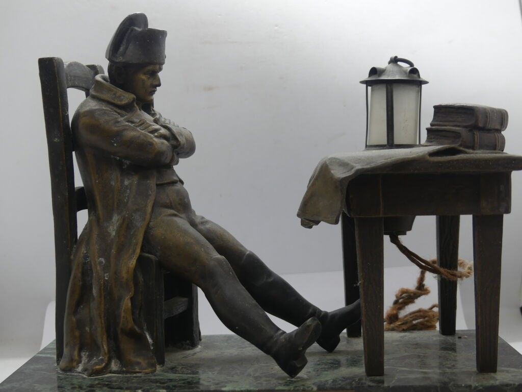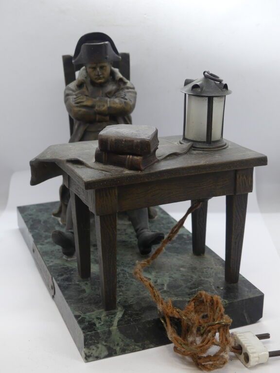 Patinated regula night-light depicting the Emperor Napoleon I, seated at his desk, deep in thought on the eve of battle. The brass cartouche on the terrace reads "La Pensée d'après Raffet par E. Carlier".