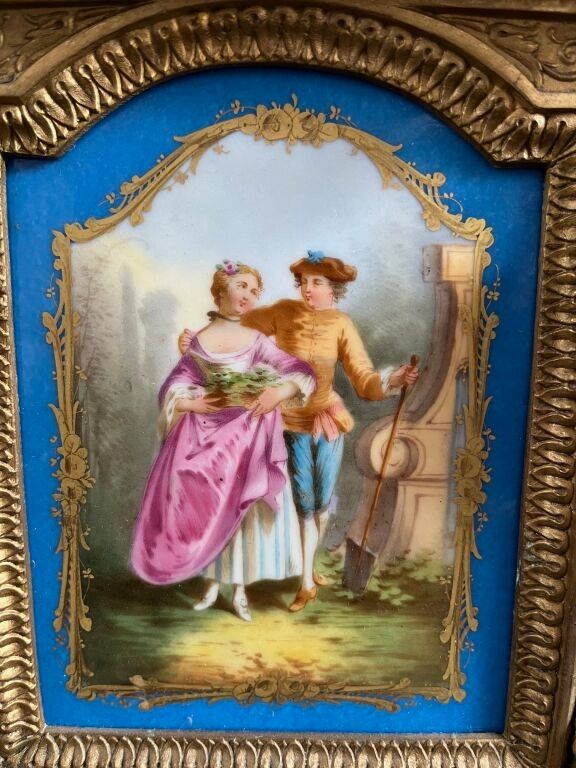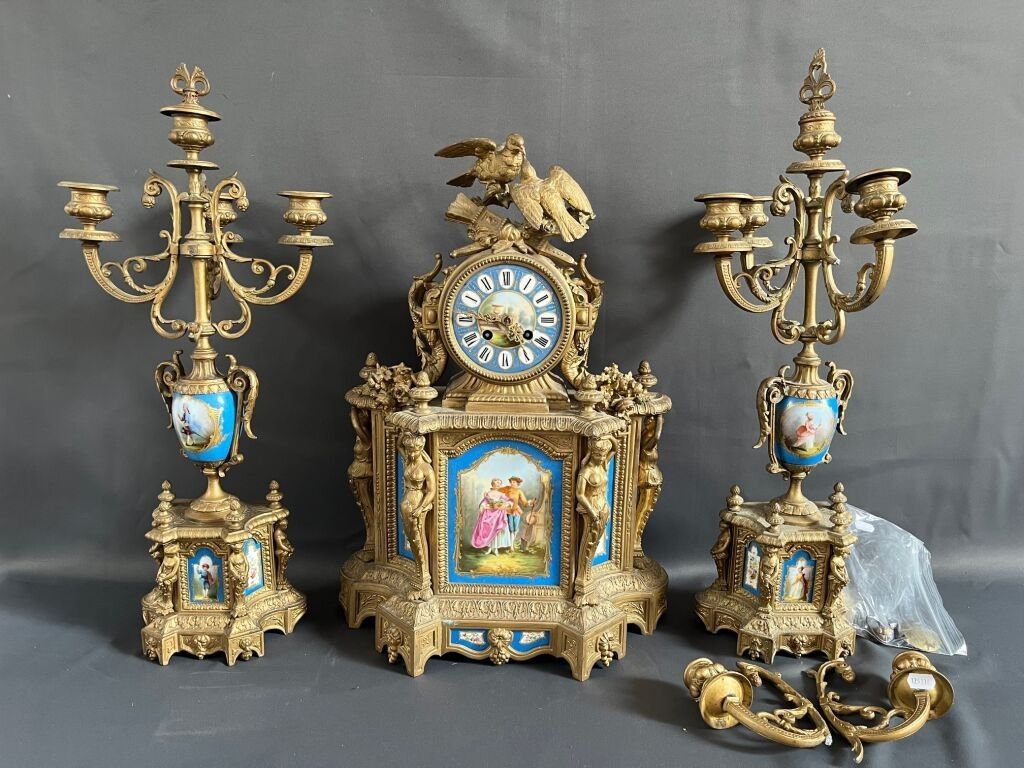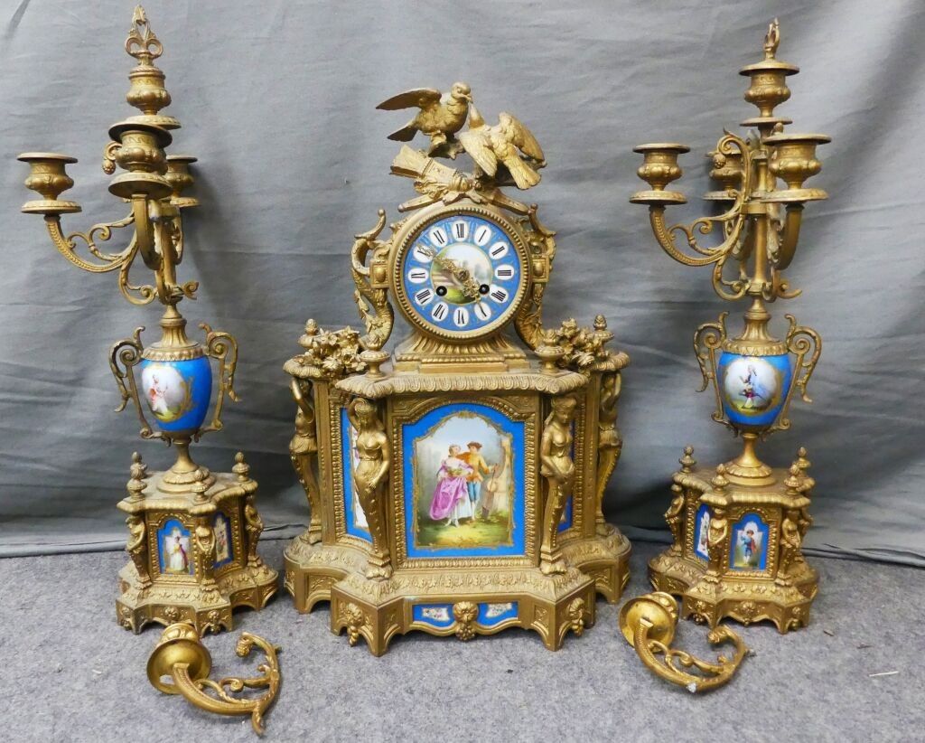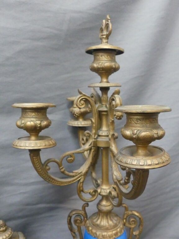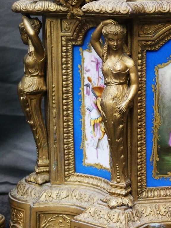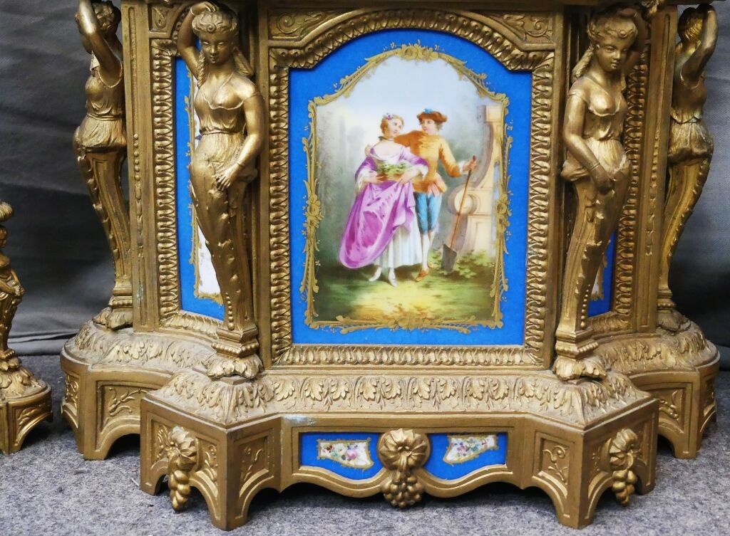 Mantelpiece including a clock decorated with a pair of birds, quivers, horns of plenty and 4 atlantes, and a pair of 4-light ormolu candelabras decorated with Sèvres porcelain plaques with gallant scenes and flowers on a blue background.