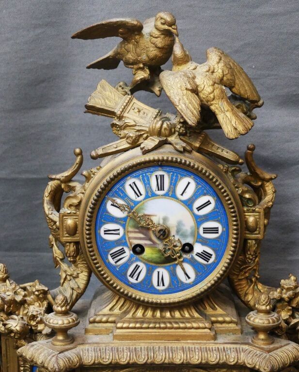 Mantelpiece including a clock decorated with a pair of birds…