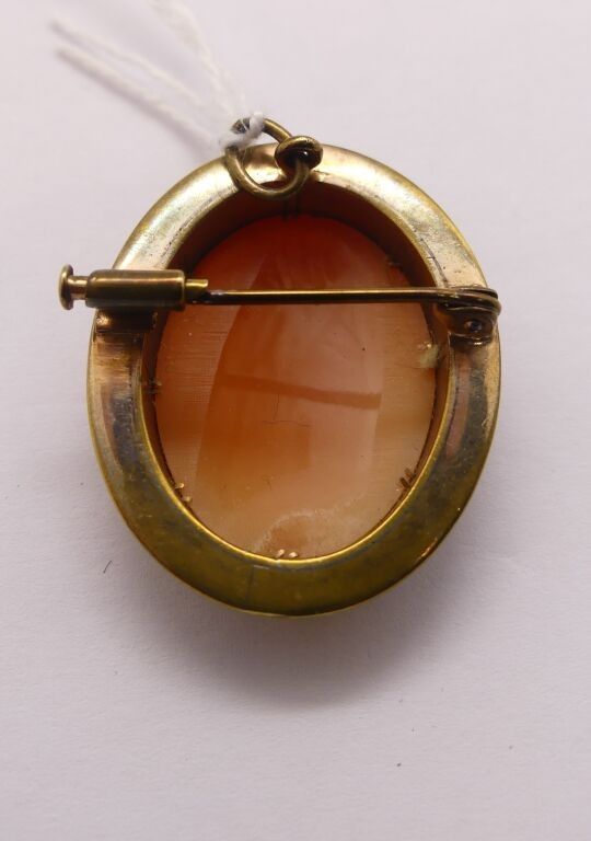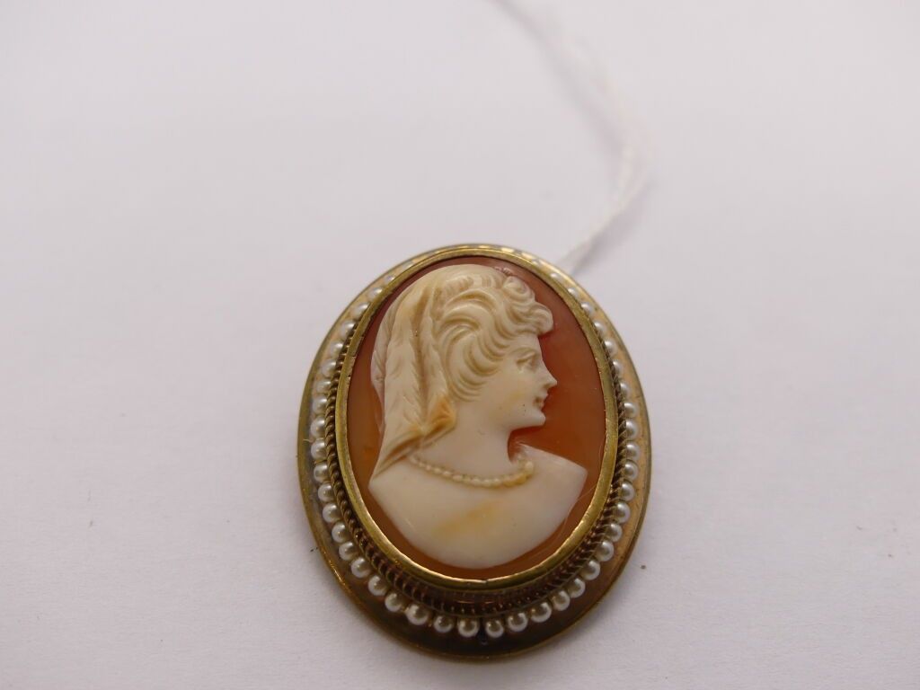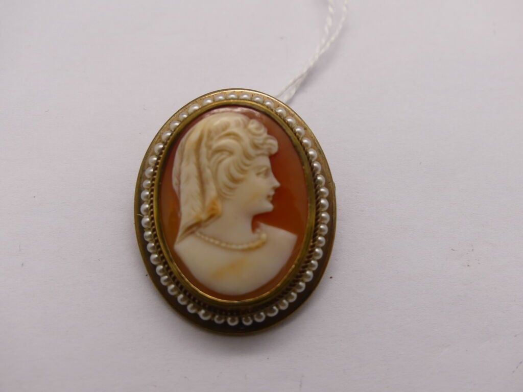 A cameo pendant brooch with a woman's profile on a shell and…