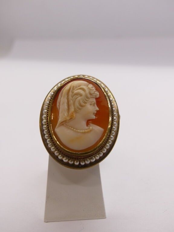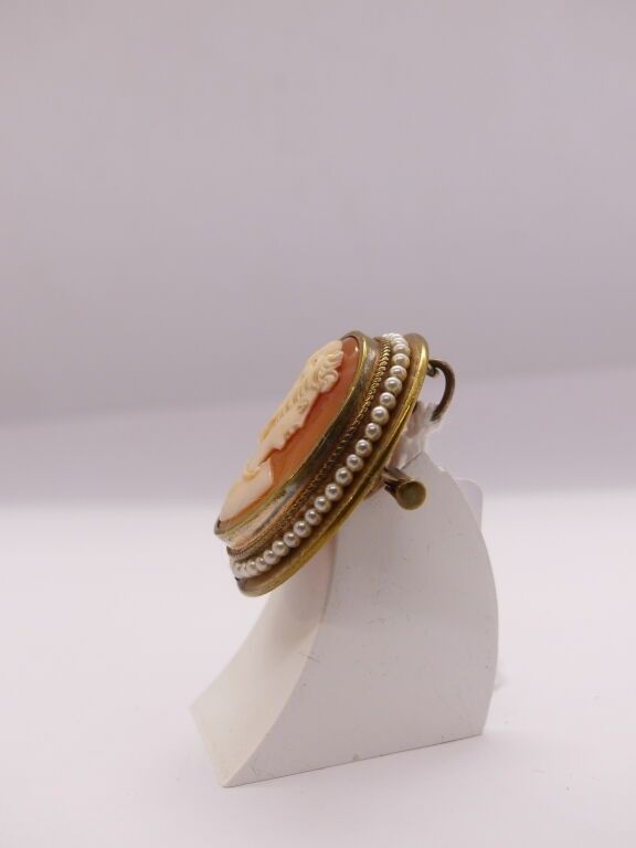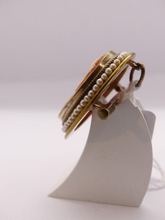 A cameo pendant brooch with a woman's profile on a shell and pearls.