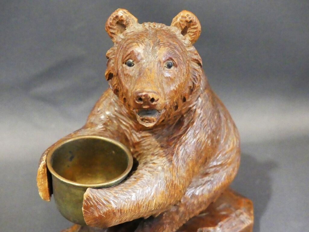 FORET NOIRE - Carved wooden bear inkwell holding a copper co…