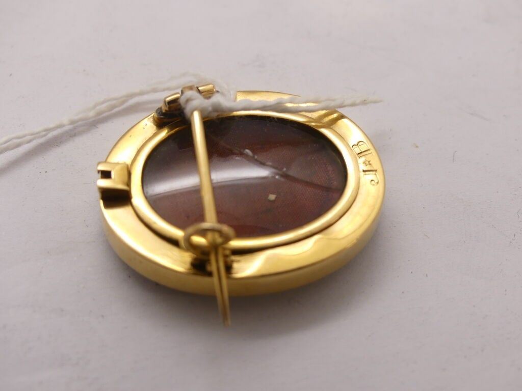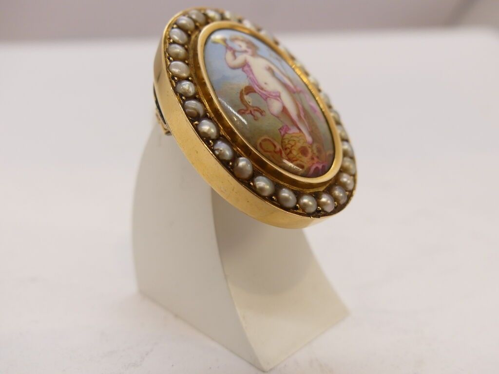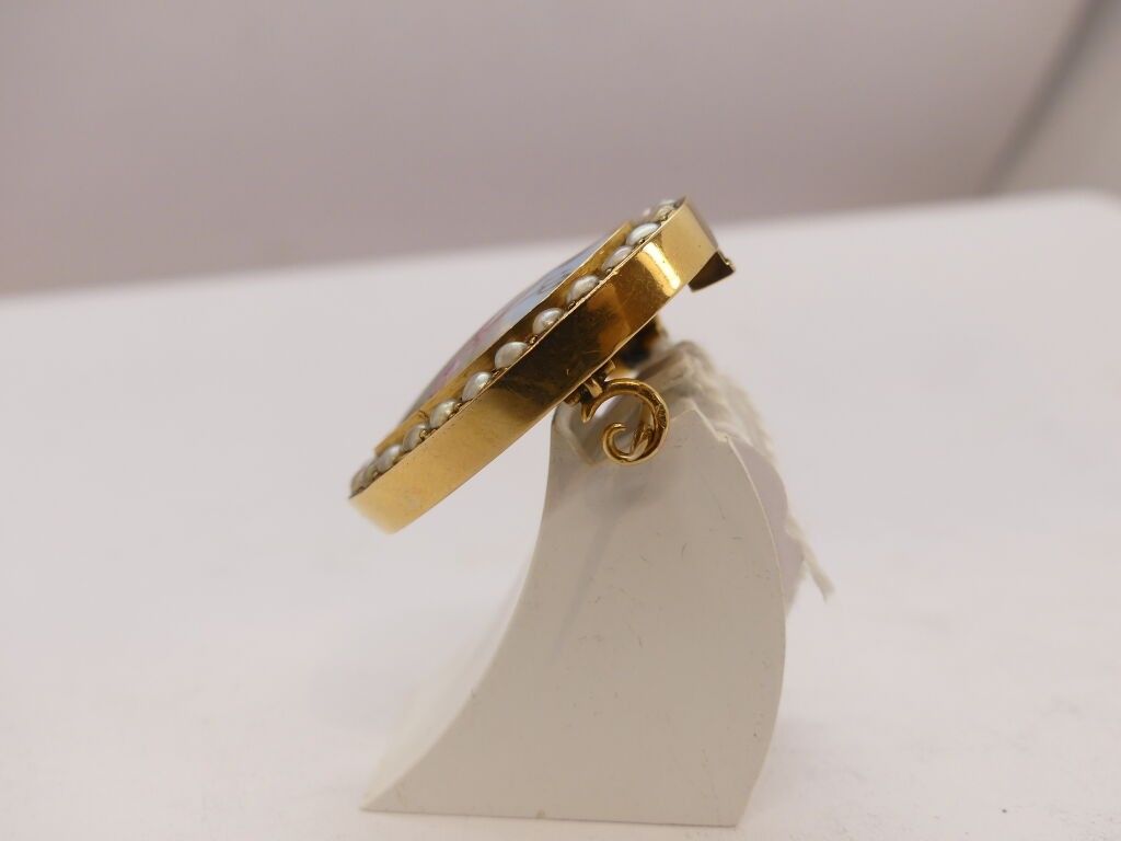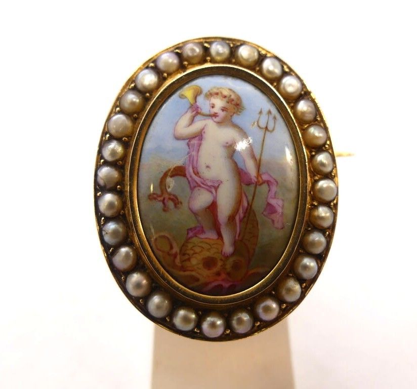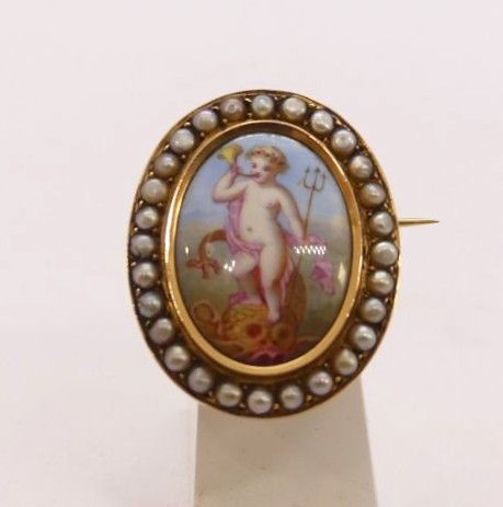 Yellow gold oval brooch set with an enamel design of a Neptune child in a pearl frame; it forms a photo holder on the back (broken glass).