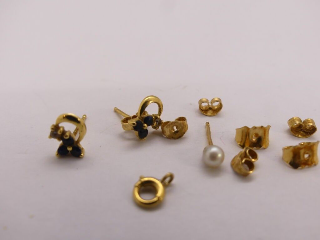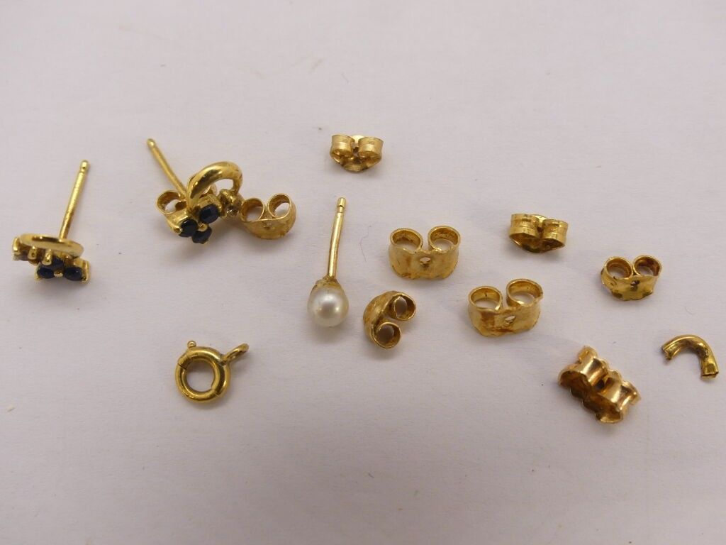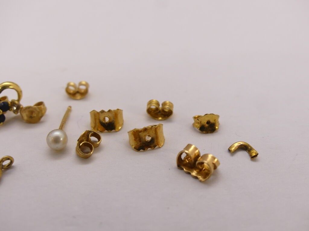 Ear studs set and clasp in yellow gold (1.2g gross) + Ear stud stoppers in yellow gold (1.2g).