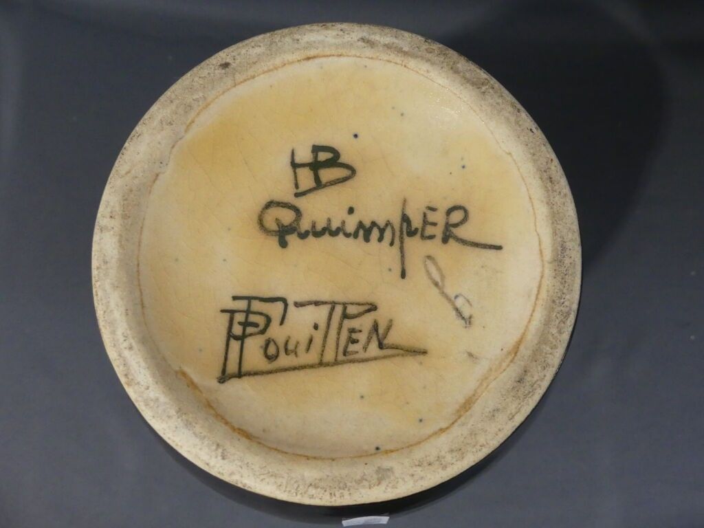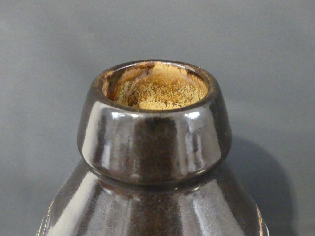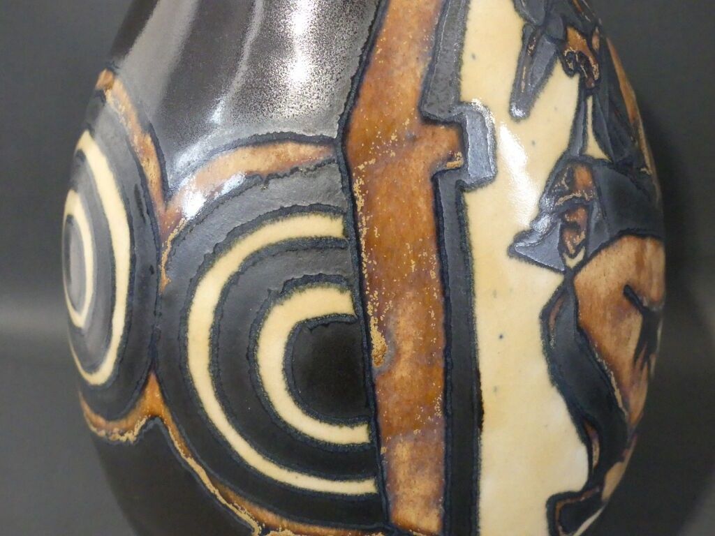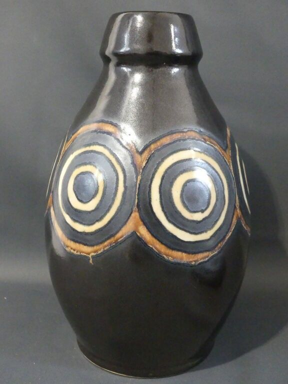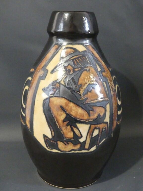 Polychrome stoneware ovoid vase with narrow neck decorated with concentric circles and a bombard player on a brown background, signed.