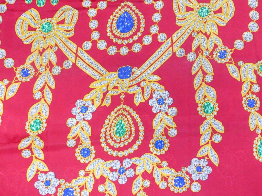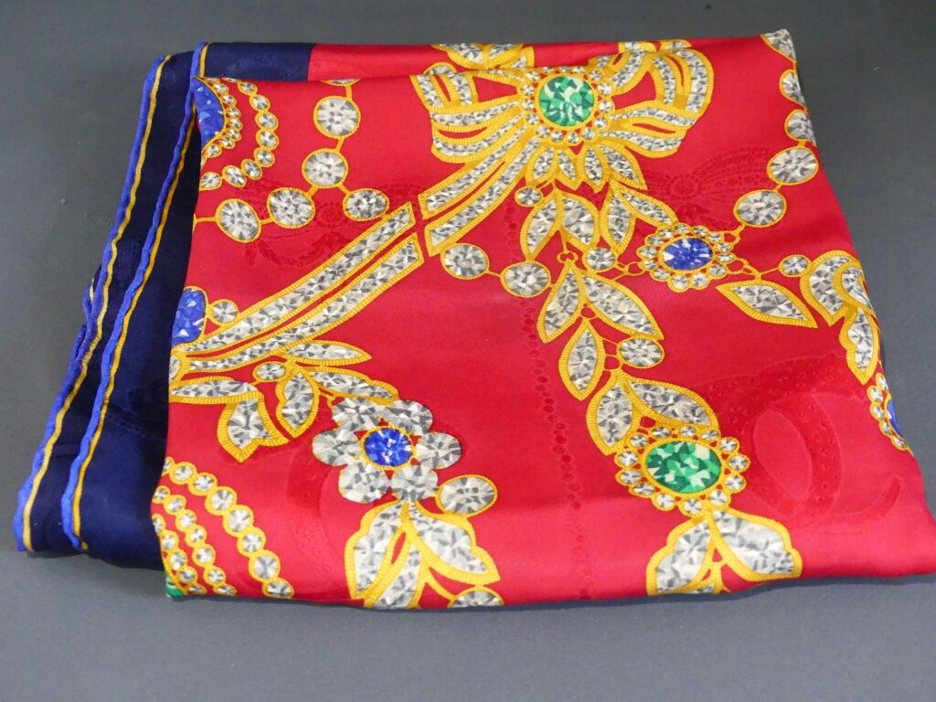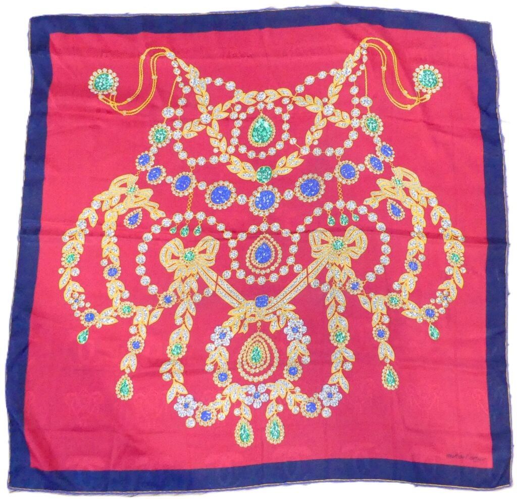 Silk scarf with burgundy background and blue border decorated with joallerie