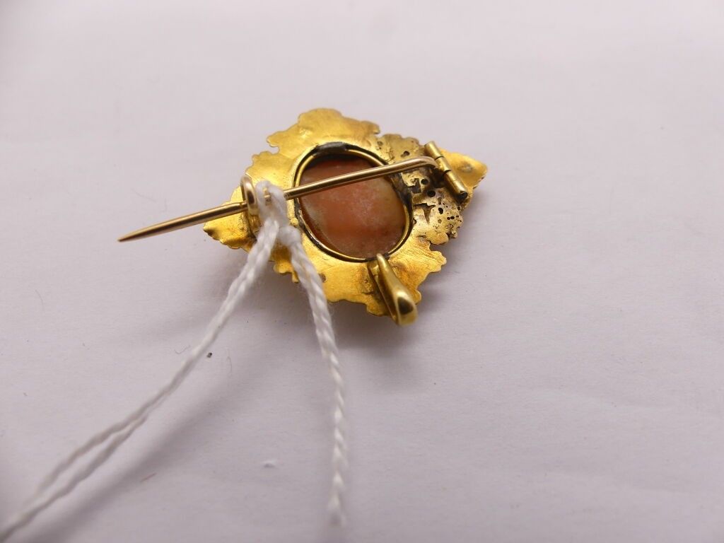 Diamond-shaped yellow gold brooch centred on a shell cameo w…