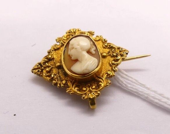 Diamond-shaped yellow gold brooch centred on a shell cameo with a female profile, late 19th century