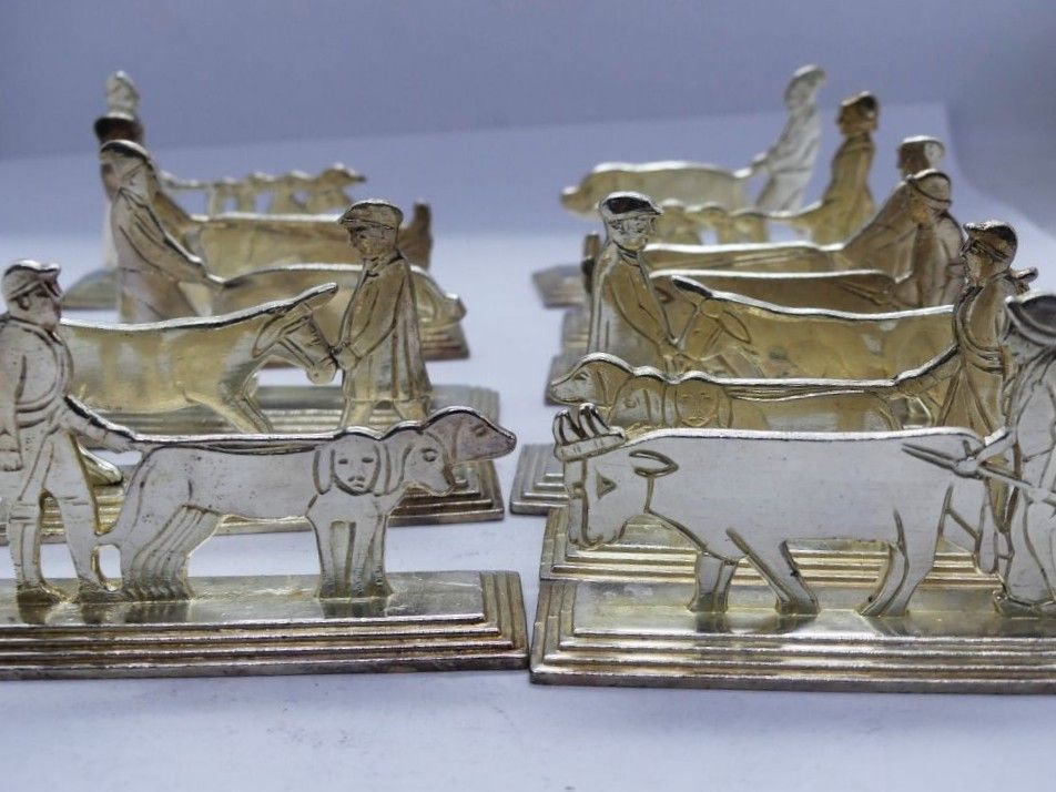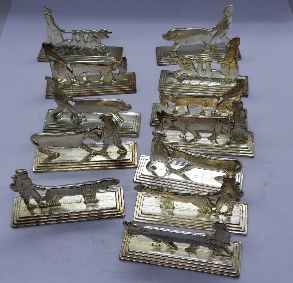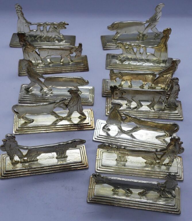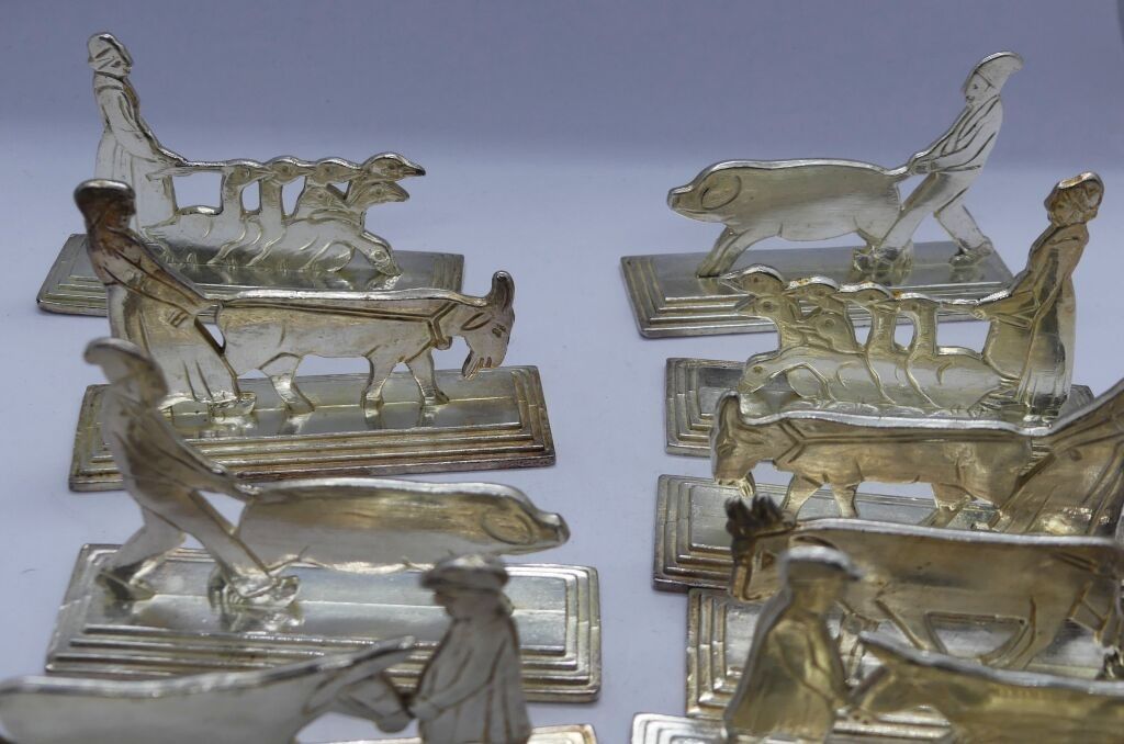 Suite of 12 silver-plated knife-holders depicting a goose keeper, peasants with oxen, a pig and a donkey, and a horn-ringer with a dog.