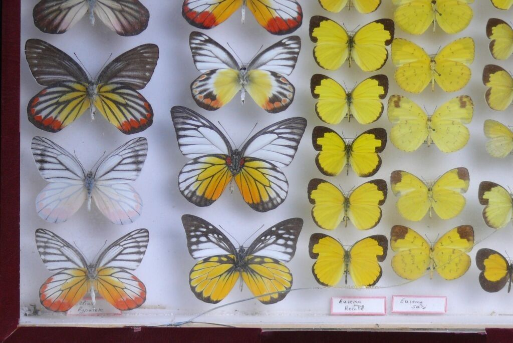 Exotic Pieridae including Delias hyparete, Hebomoia leucippe, Valeria, Eurema. Minor damage.