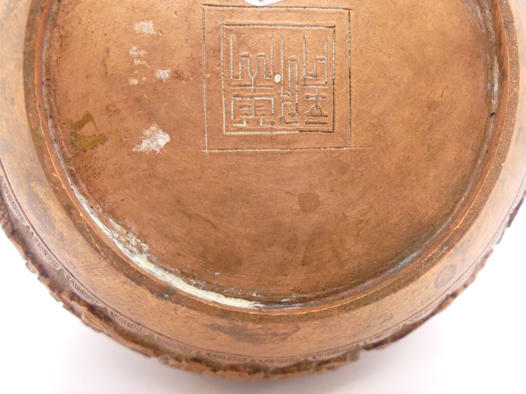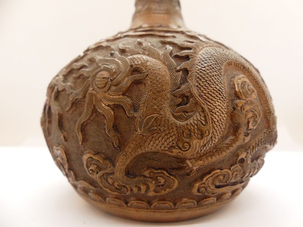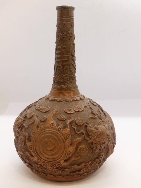 CHINA - A copper ball vase with a long neck decorated with dragons, signed.