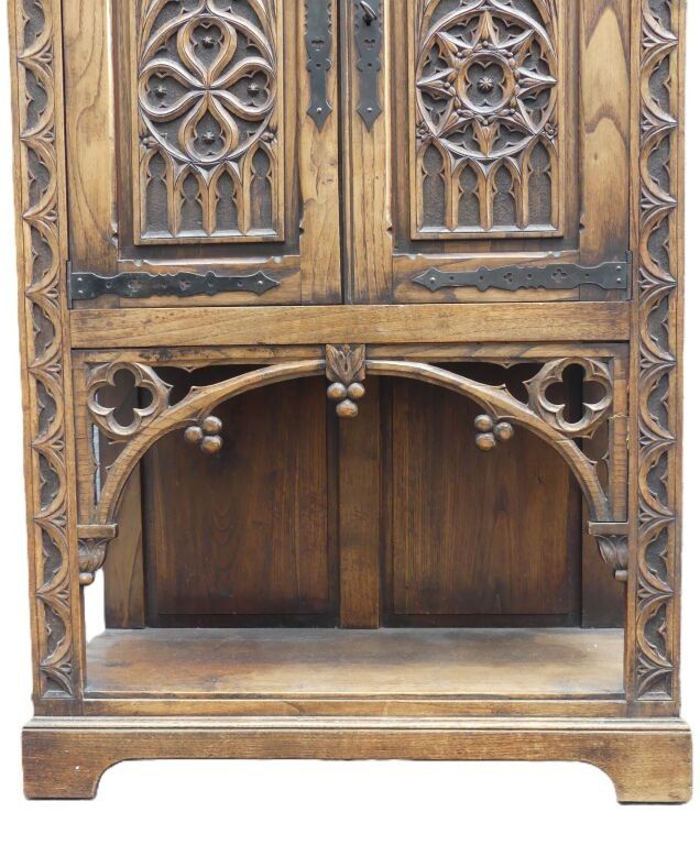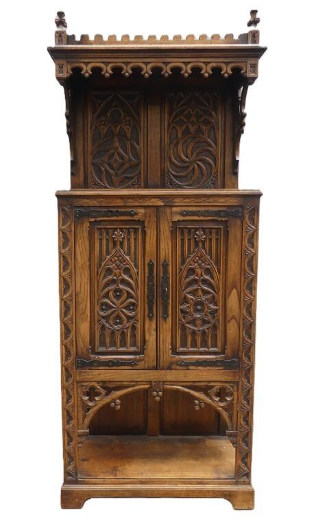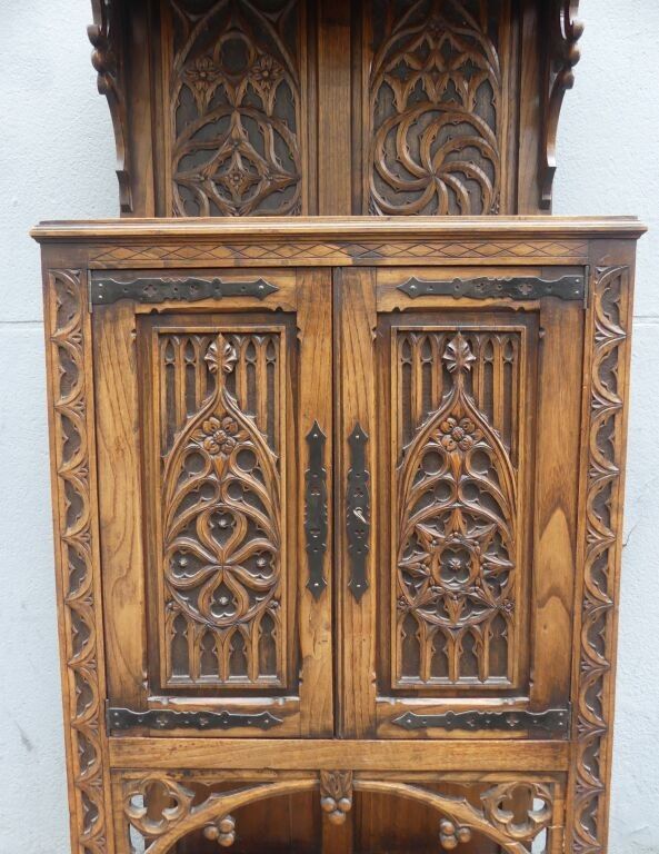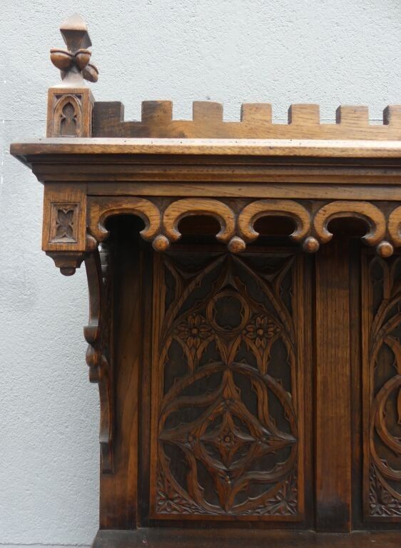 Neo-Gothic style sideboard in carved moulded oak opening onto two doors, two niches, decorated with Gothic fenestration.