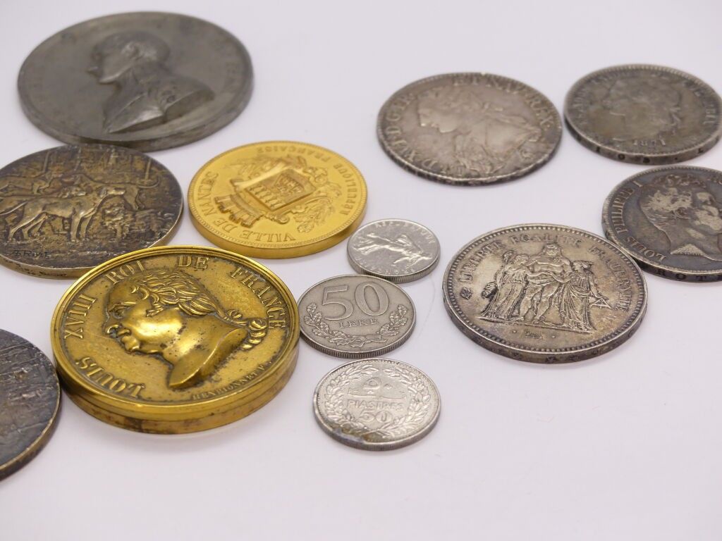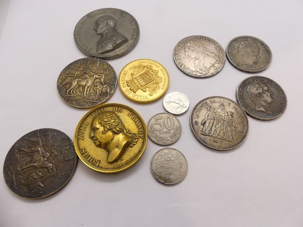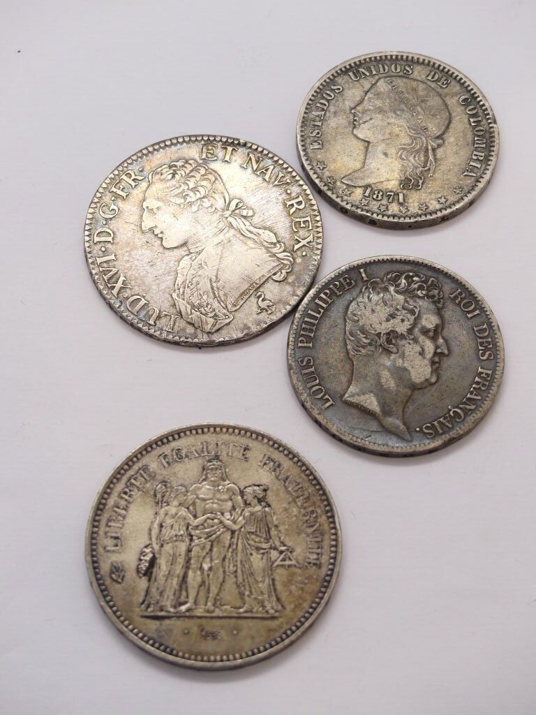 Silver coins : Louis XVI Head of the king on the left, wearing a catogan 1788 smooth edge, 50 francs French Republic, 5 francs Louis-Philippe 1830, Estados unidos de Colombia 1871