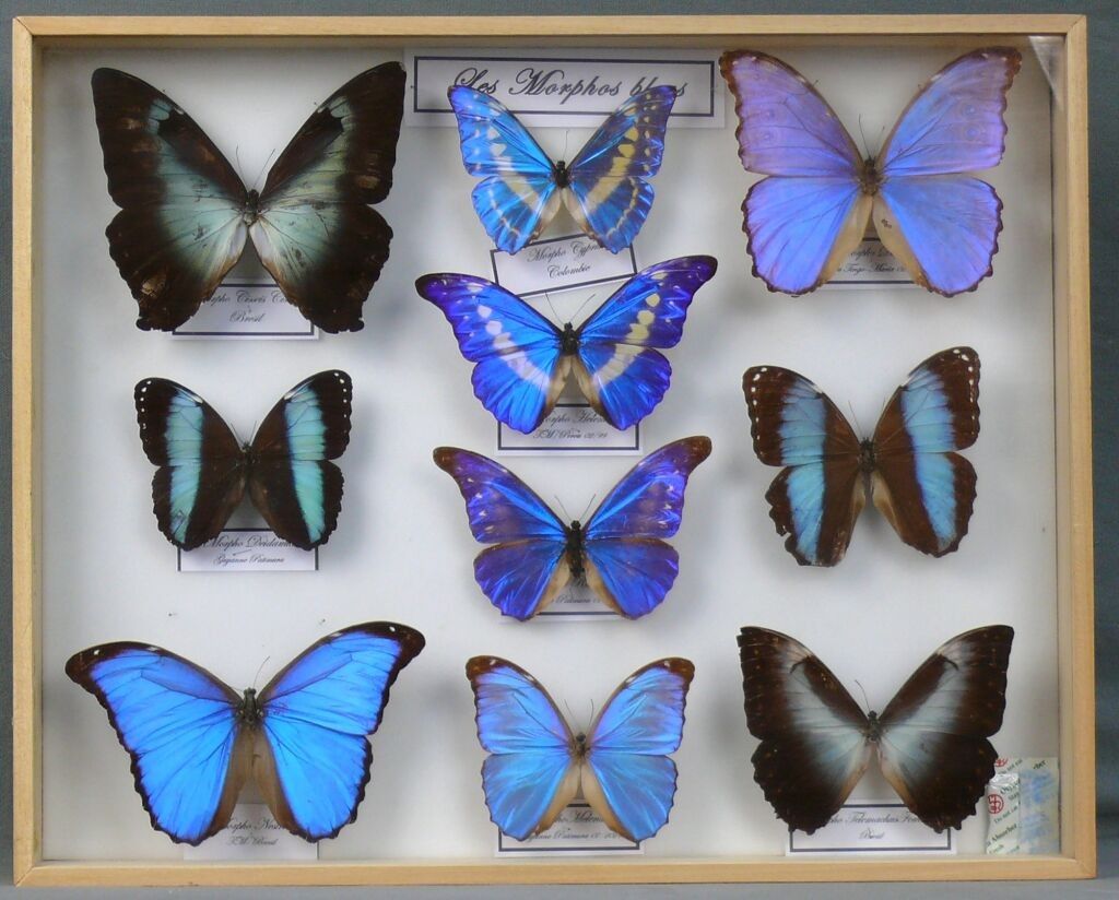 South American morphos including cypris, helena, rhetenor males. Small tears and rubbing.