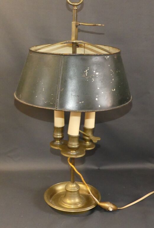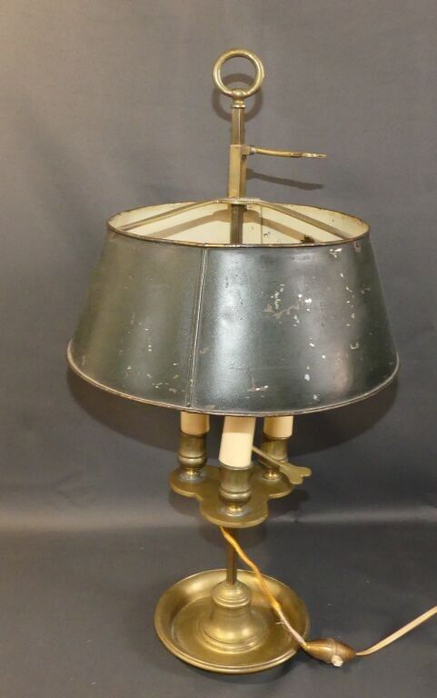 Electrified brass and green lacquered sheet metal hot water bottle lamp,