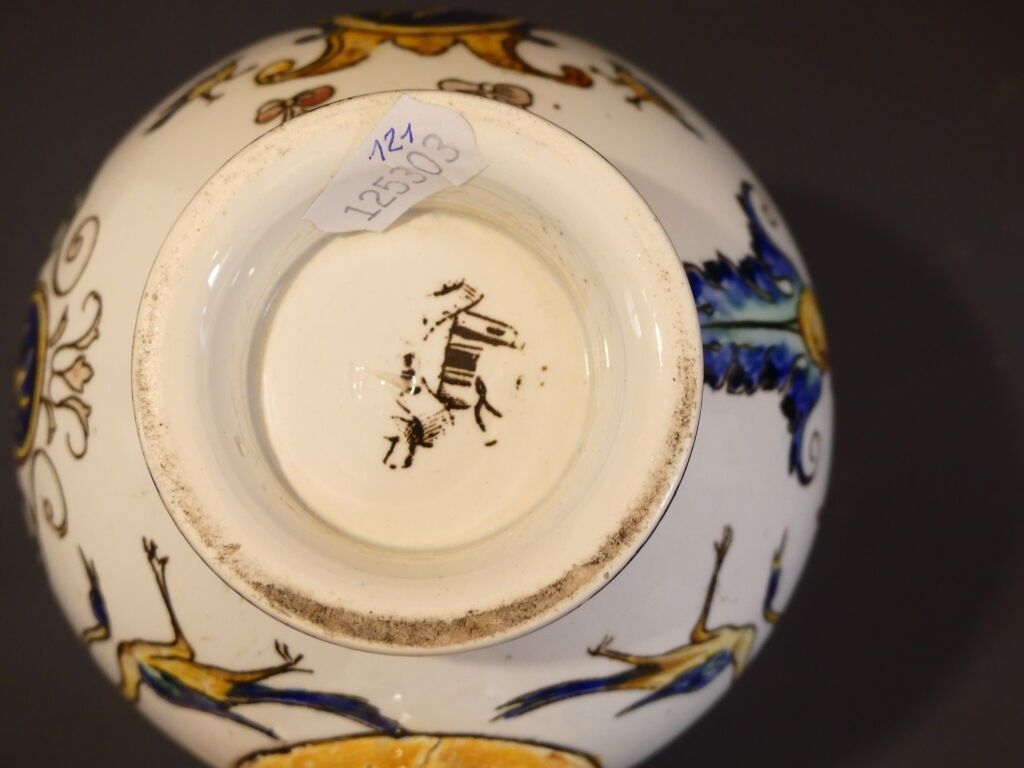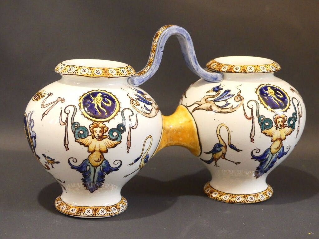 Earthenware double vase with a handle decorated with Italian grotesques on a white background