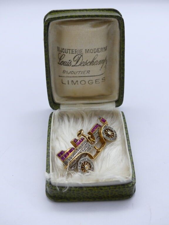 Two-tone gold brooch in the shape of a tacot set with pink sapphires and round diamonds, with wheels and turnings, marked "Félicité juin 1912".