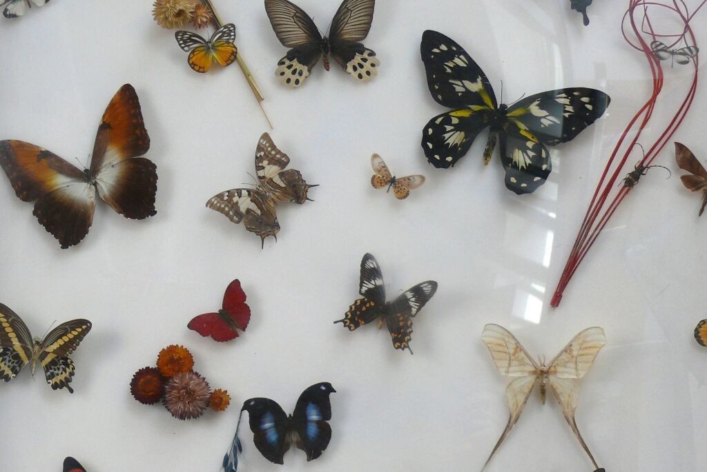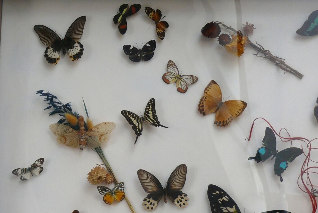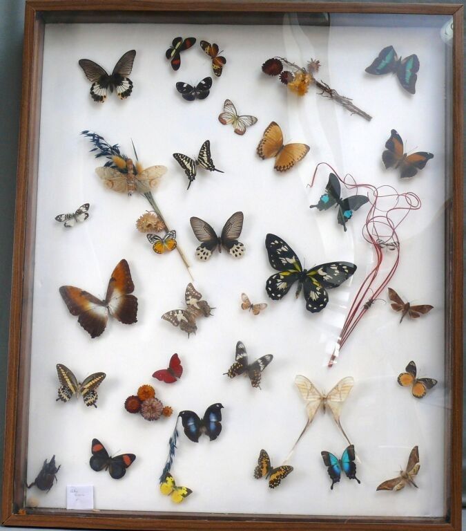 Large decorative frame of various exotic lepidopterans and insects including M. hecuba , O. victoriae ssp. femelle(CITESII/UEB with Cites no.), Papilio, sphinx, fulgore Laternaria etc. Slight discoloration.