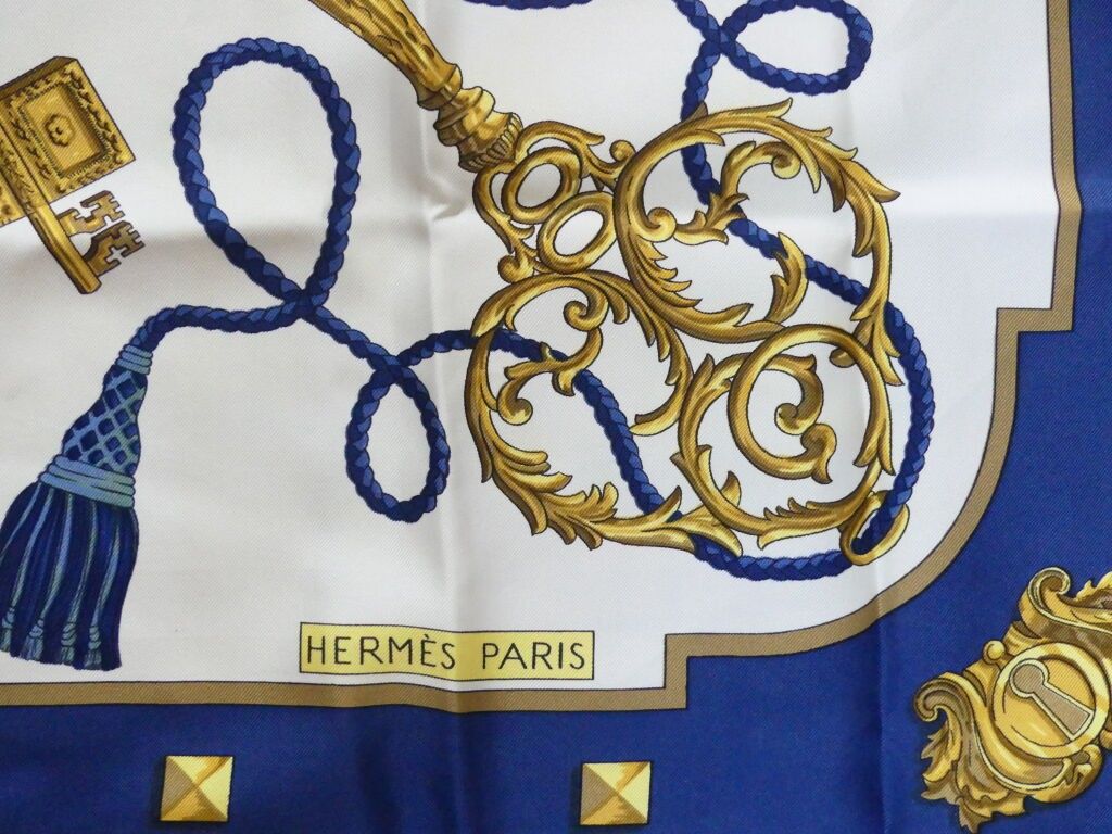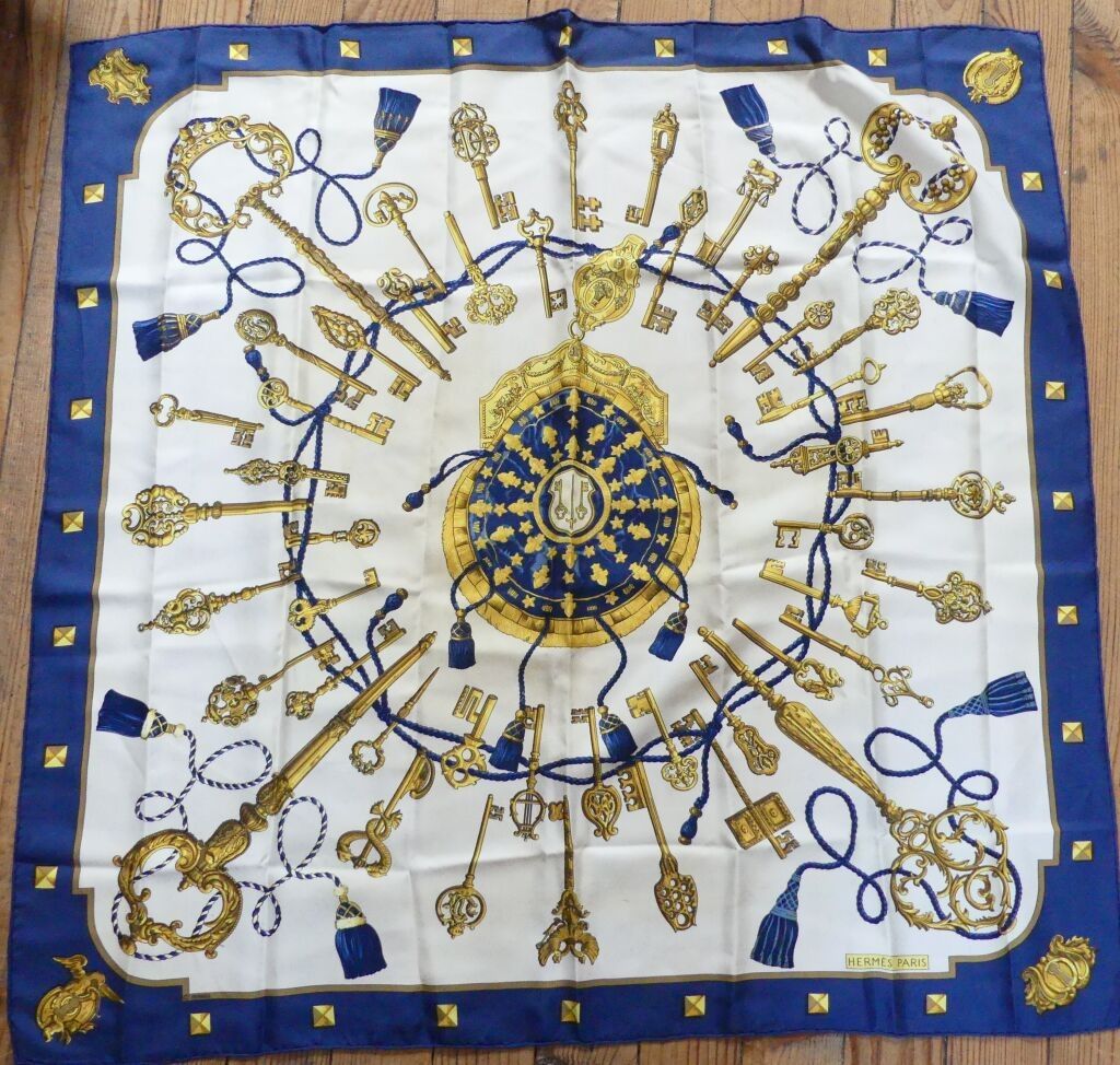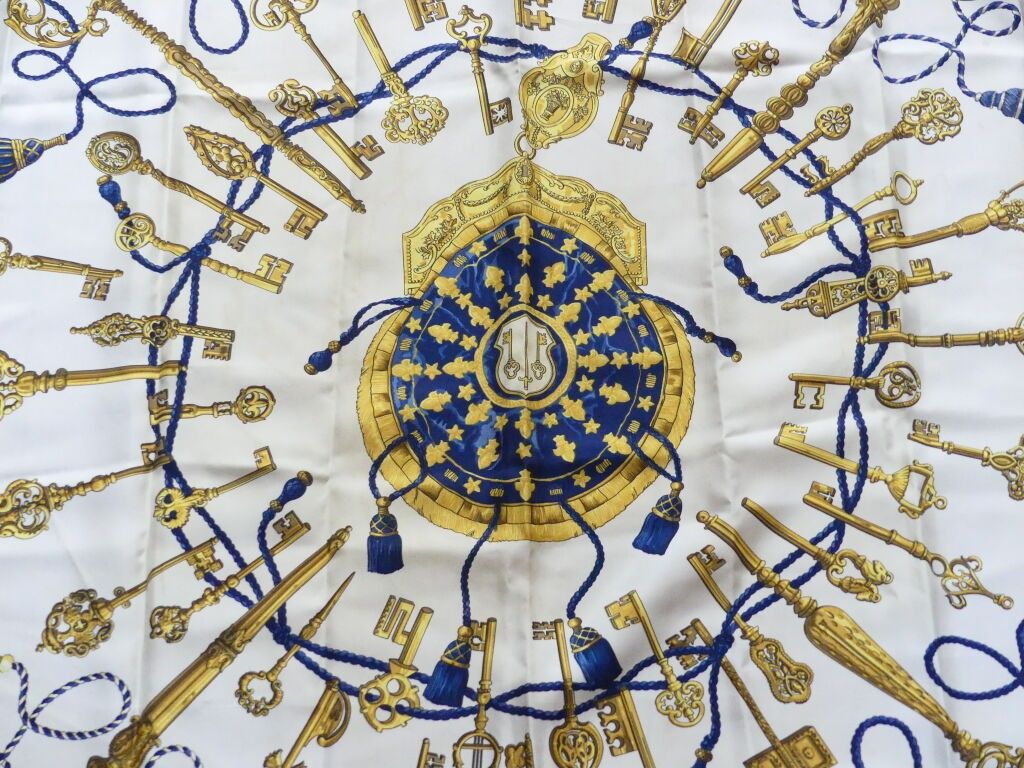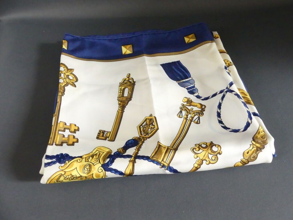 Silk square with cream background and blue borders decorated with gold keys and trimmings