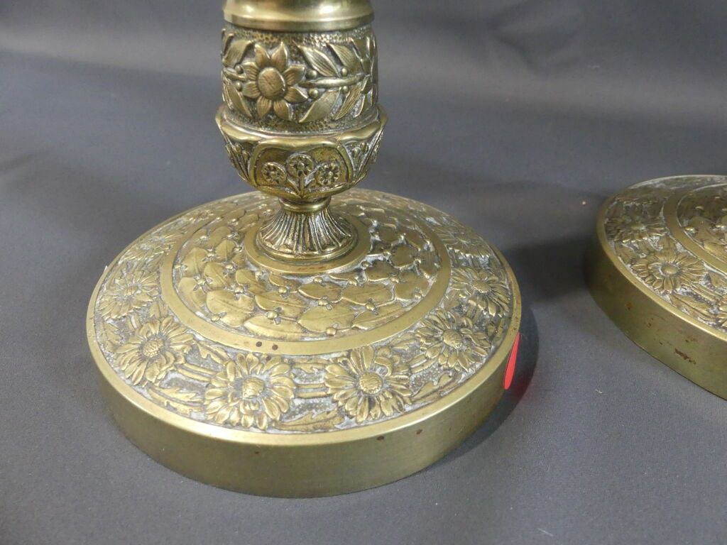 Pair of gilt brass torches with fluted shafts and floral dec…