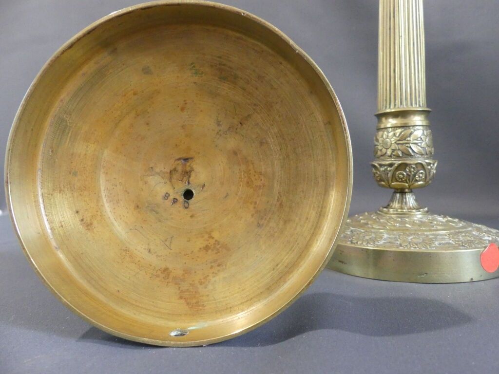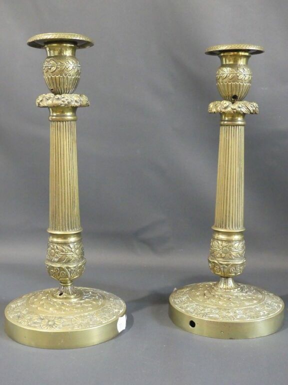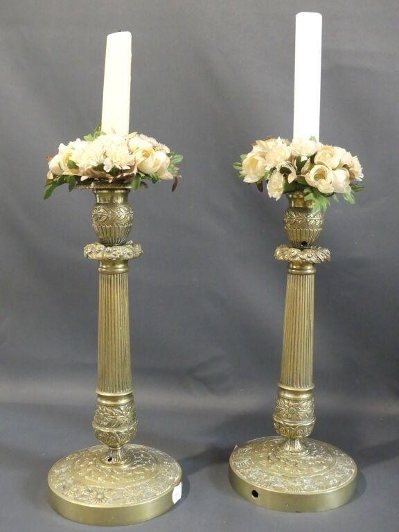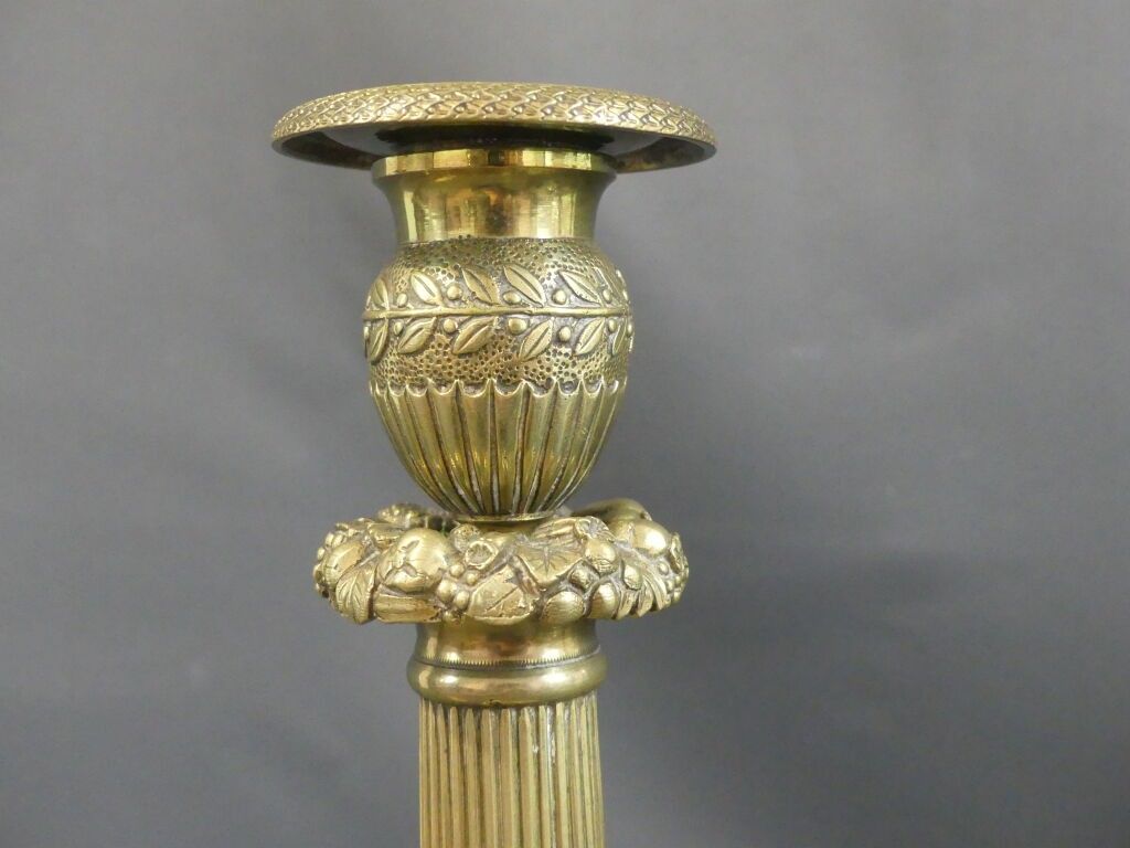 Pair of gilt brass torches with fluted shafts and floral decoration. Restoration period.